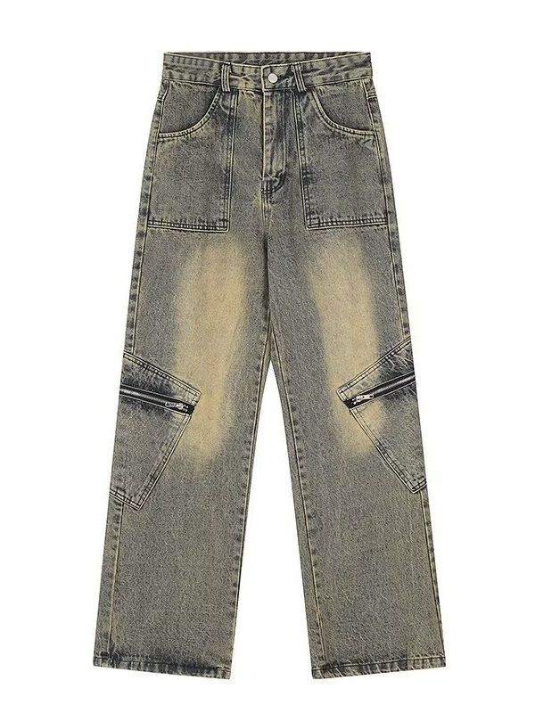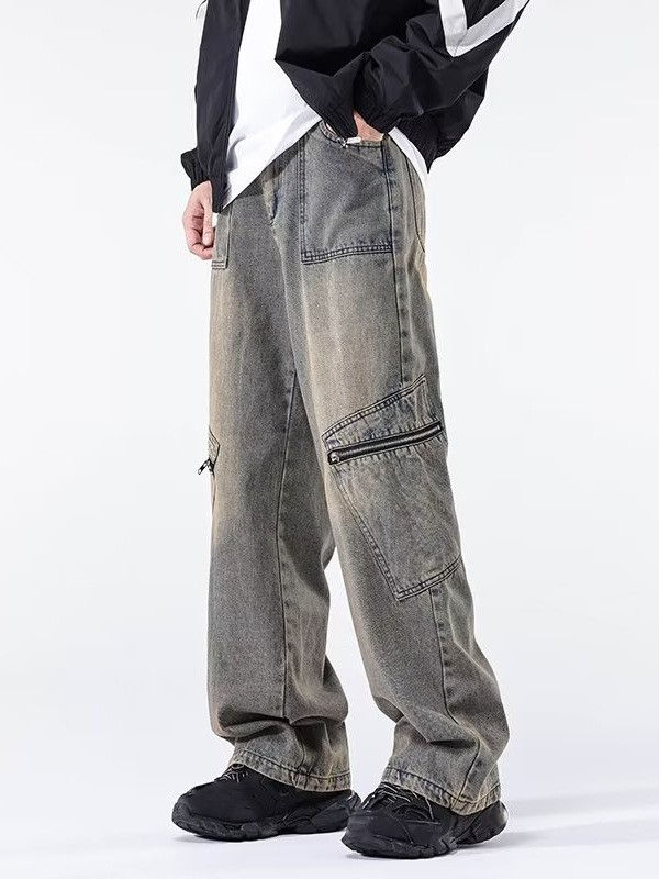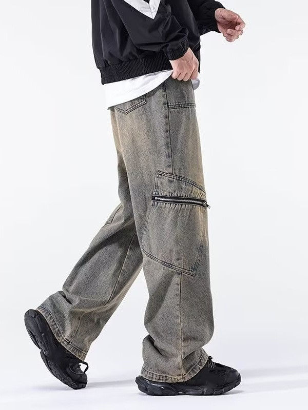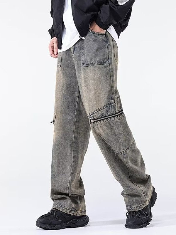 กางเกงยีนส์ขาตรงสไตล์วินเทจสำหรับผู้ชายทรงหลวมขนาดกลางดูหล่อ