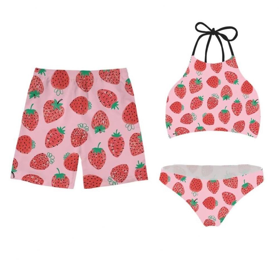 ชุดว่ายน้ำลายสตรอว์เบอร์รีแบบกำหนดเอง ชุดบิกินี่และชุดชายหาดสำหรับผู้หญิงแบบสองชิ้น และกางเกงขาสั้นสำหรับผู้ชาย ชุดว่ายน้ำคู่รักแบบเข้าชุดกัน