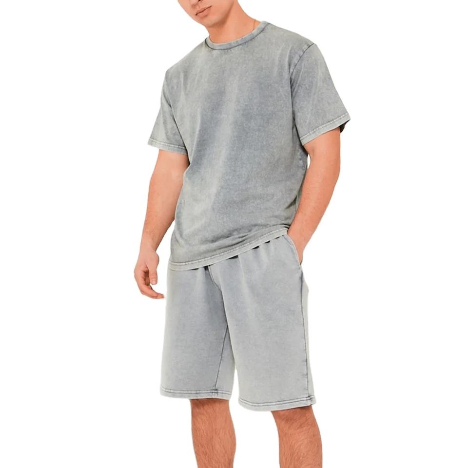 ชุดเซ็ตเสื้อยืดและกางเกงขาสั้นสไตล์สตรีทแวร์สำหรับผู้ชาย ฤดูร้อน บริการ OEM เสื้อผ้าลำลองผู้ชาย กางเกงขาสั้นย้อมสีแบบ Acid Wash เสื้อยืดคอกลม และบริการปรับแต่ง