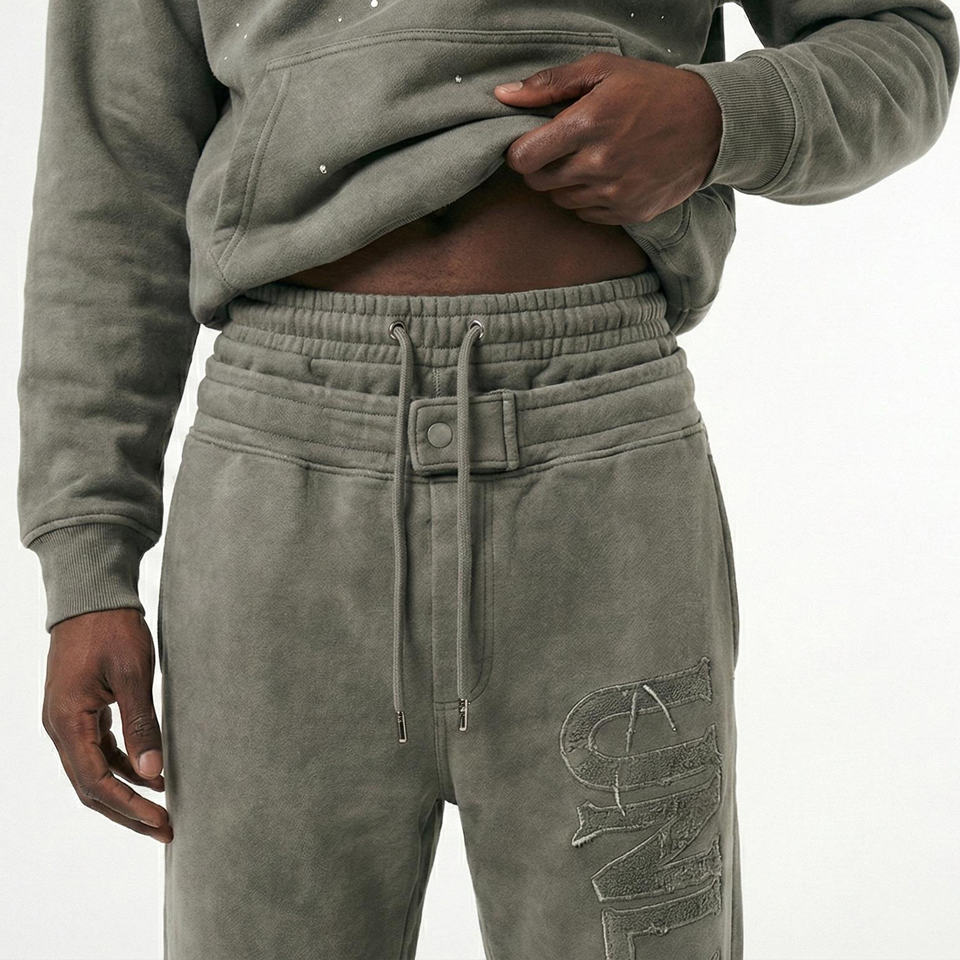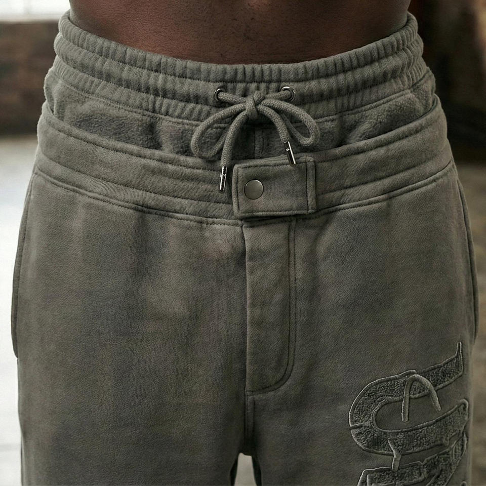 กางเกงวอร์มขาบานทรงเอวสูงสองชั้นแบบยีนส์ฟอกสีสไตล์สตรีทแวร์สำหรับผู้ชาย