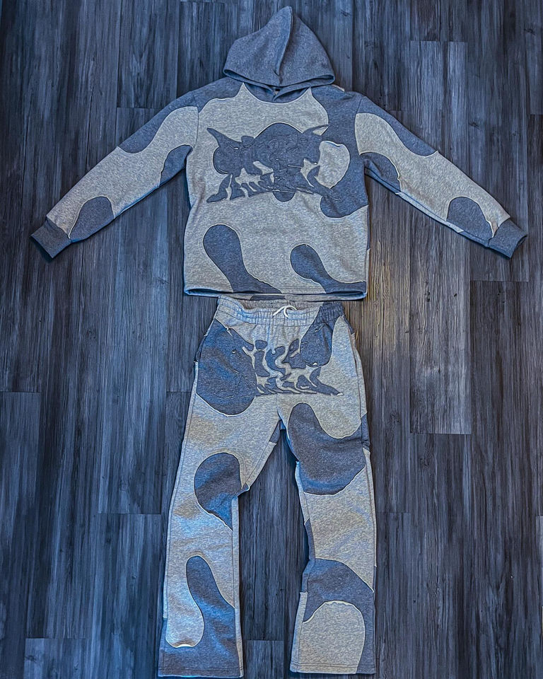 ชุดแทรคสูทผ้าฝ้ายปักลายโลโก้สไตล์สตรีทแวร์แบบทำเก่า ลุคซันเฟด ย้อมสีแบบแอซิดวอช ทรงโอเวอร์ไซส์สำหรับผู้ชาย