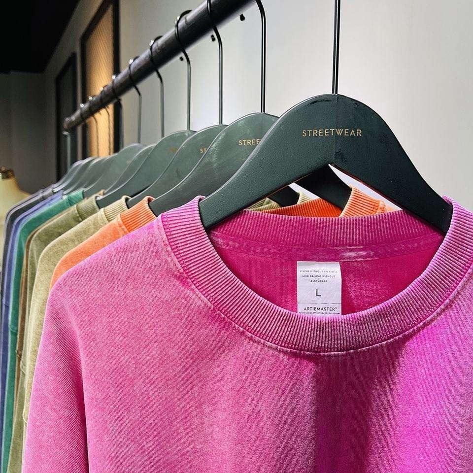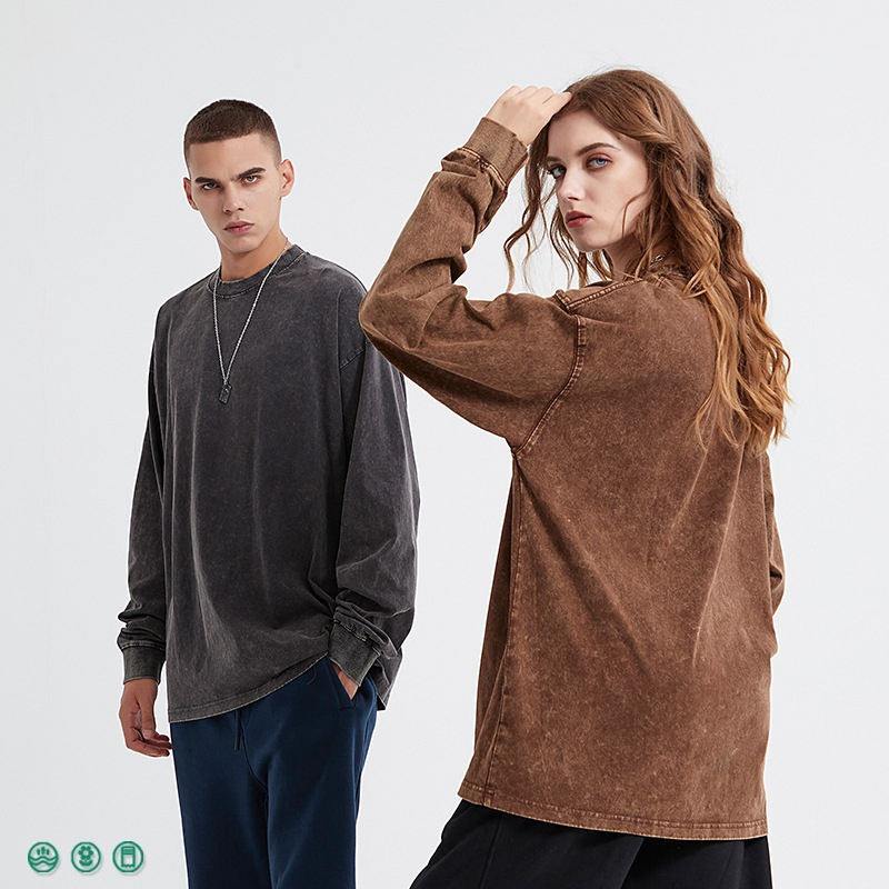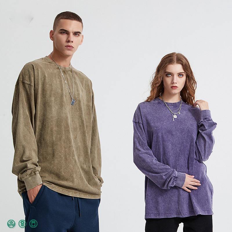 เสื้อยืดแขนยาวสำหรับผู้ชายเสื้อวินเทจซักกรดแขนยาวใช้ได้ทั้งชายและหญิง