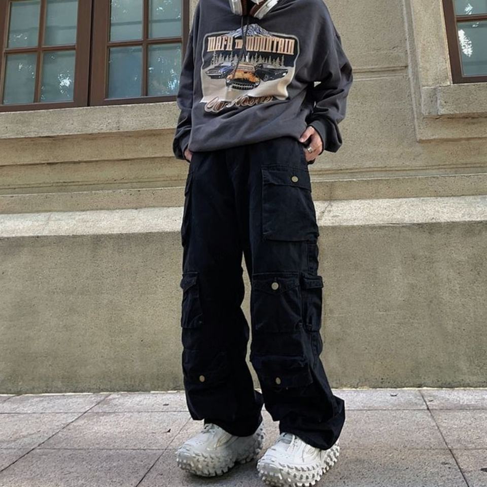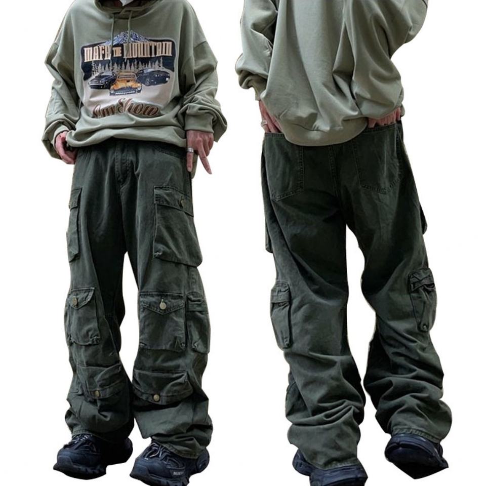 กางเกงคาร์โก้สไตล์ฮาราจูกุทรงหลวมแบบสบายๆ หลายกระเป๋า สำหรับผู้ชาย แฟชั่นสตรีทแวร์สุดฮิต