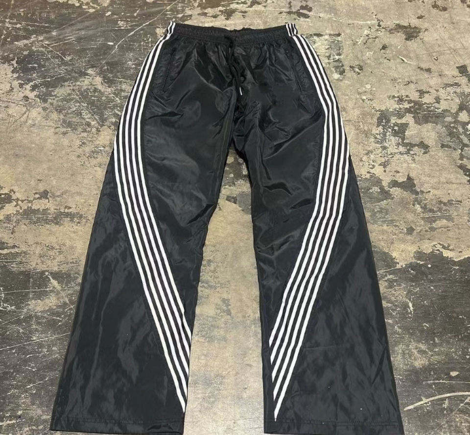 กางเกงแทร็คสตรีทแวร์ลายทางผ้าโพลีเอสเตอร์ปักโลโก้ทรงโอเวอร์ไซส์ขากว้างสไตล์แบ็กกี้สำหรับผู้ชาย