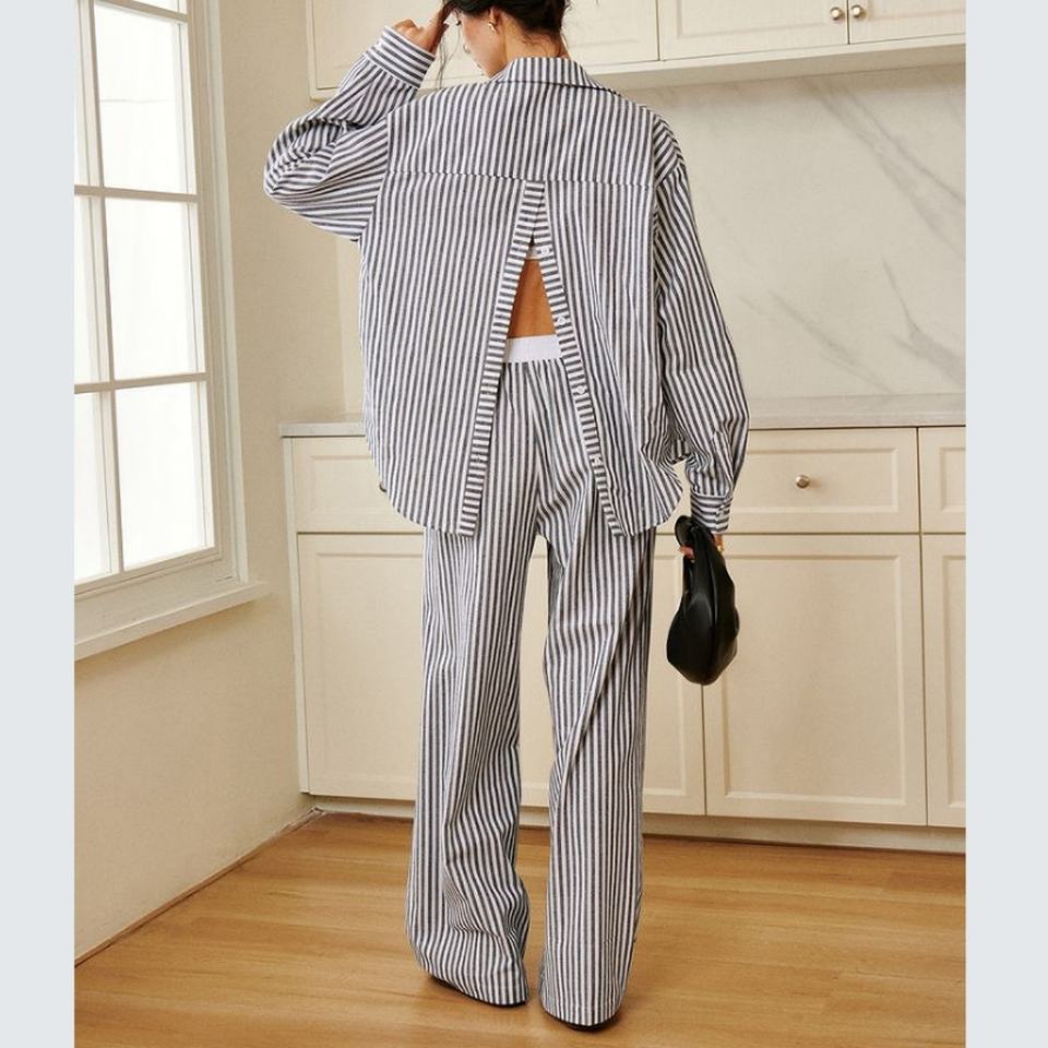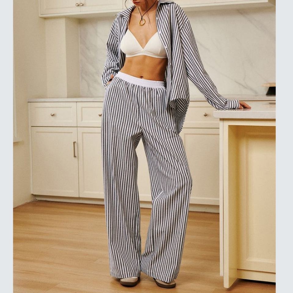 ชุดสูทลายทางแบบกำหนดเอง คุณภาพสูง ดีเทลด้านหลัง ชุดเซ็ตสองชิ้นผ้าฝ้ายสำหรับผู้หญิงฤดูร้อน กางเกงหลวม ชุดเซ็ตสองชิ้นสำหรับผู้หญิง