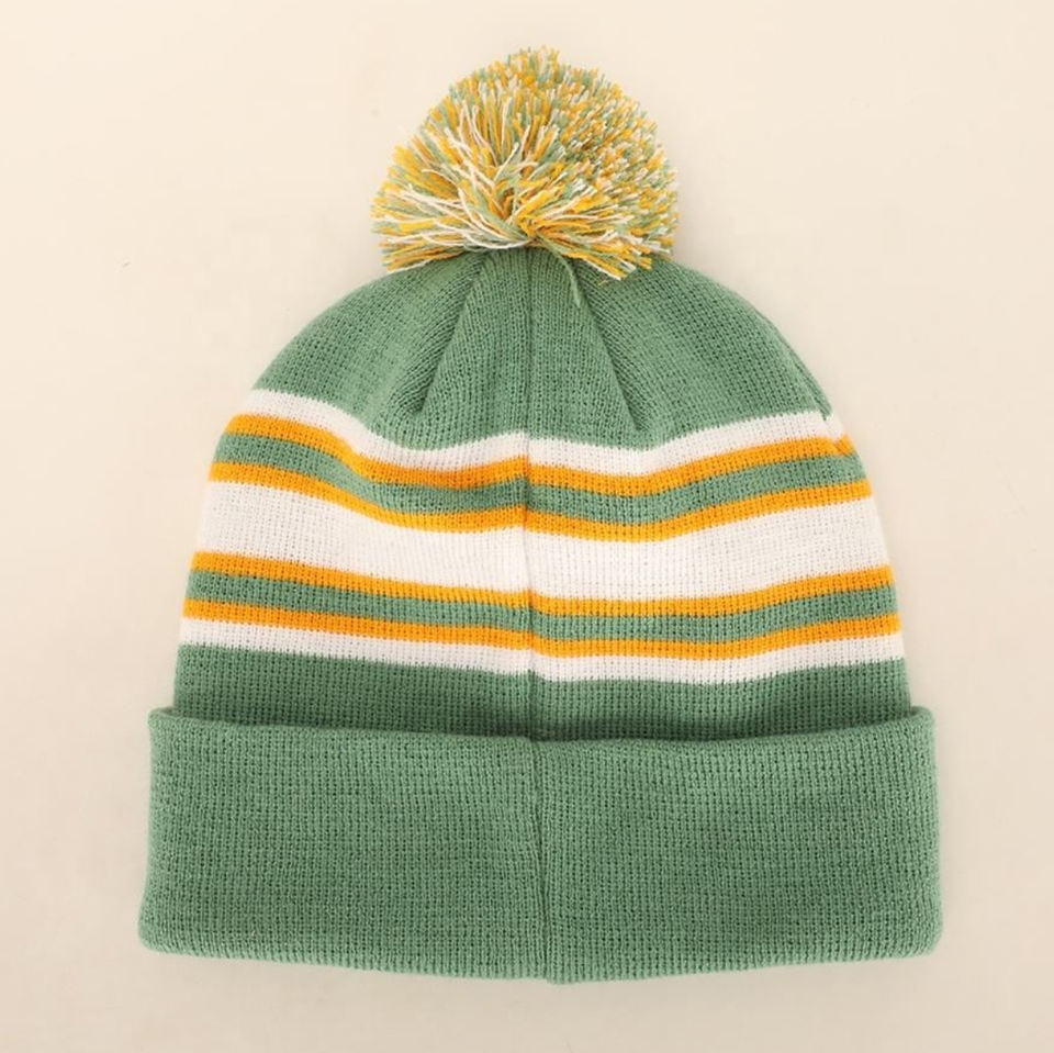 หมวกบีนนี่อะคริลิกลายทางแบบกำหนดเอง พร้อมพู่ถัก หมวกไหมพรมฤดูหนาว โลโก้ยางแบบกำหนดเอง รับผลิตตามสั่ง ขายส่ง