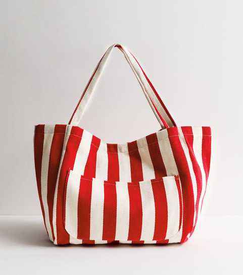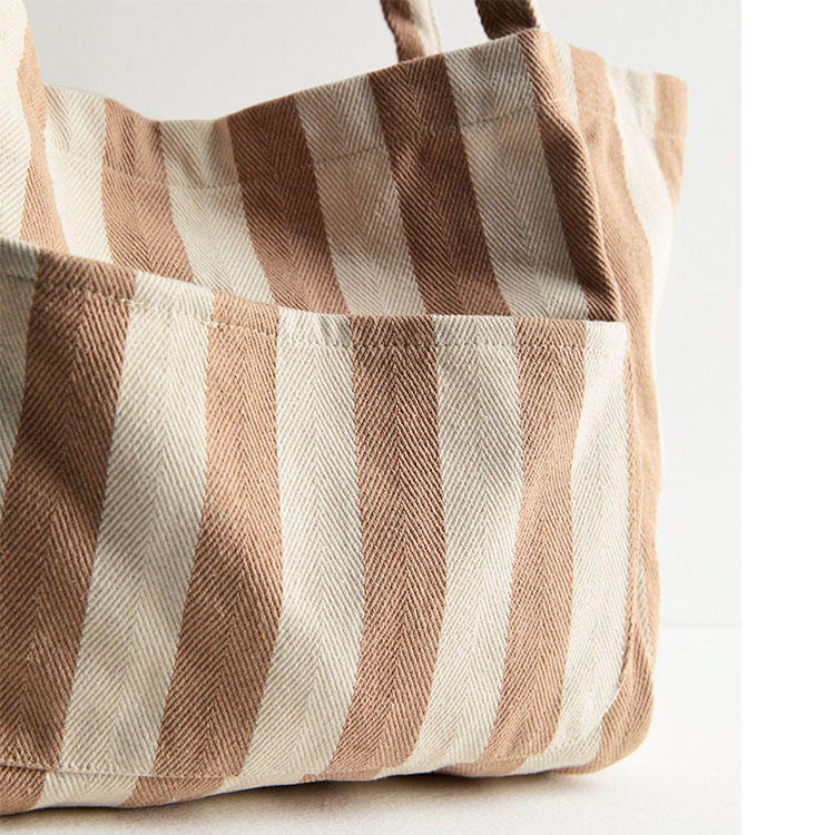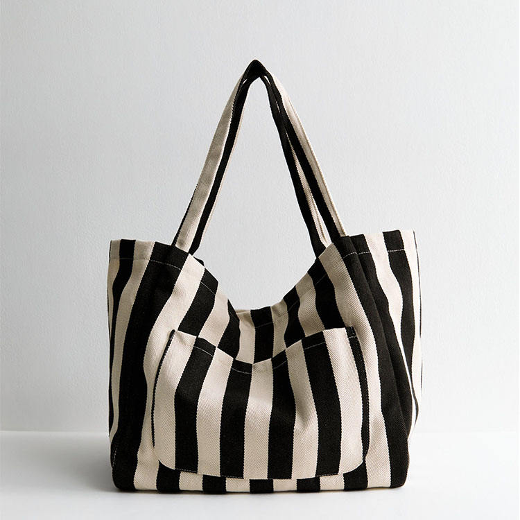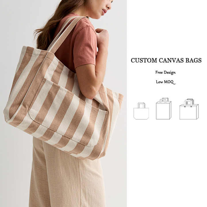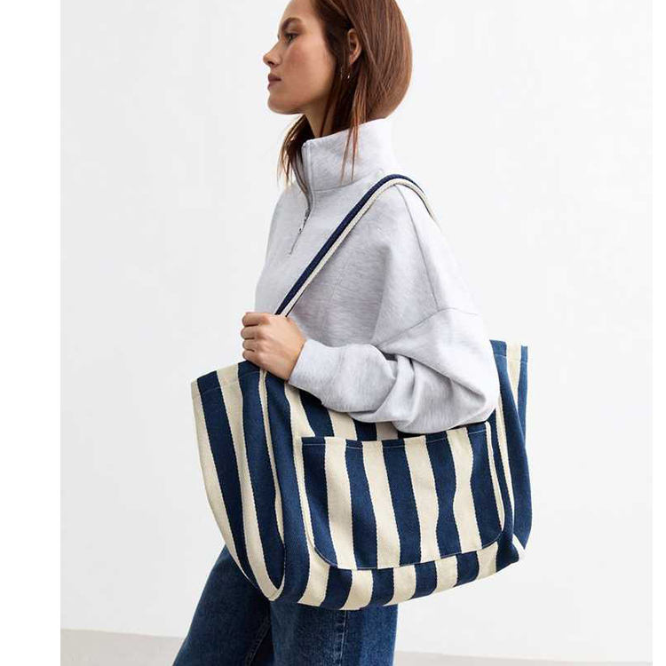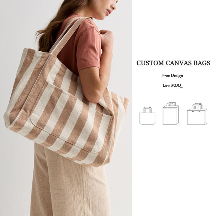 กระเป๋าถือสะพายไหล่ลายทางแบบกำหนดเอง กระเป๋าช้อปปิ้ง กระเป๋าผ้าแคนวาสขนาดใหญ่แบบเป็นมิตรกับสิ่งแวดล้อม พร้อมช่องด้านนอก