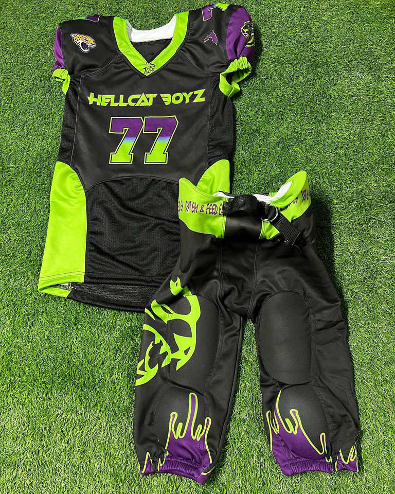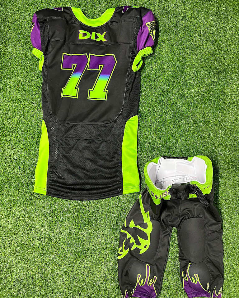 ชุดอเมริกันฟุตบอลแบบซับลิเมชั่นสั่งทำ เสื้ออเมริกันฟุตบอล ผ้าโพลีเอสเตอร์ กางเกงแบบมีแผ่น งานพิมพ์ซับลิเมชั่น ไซส์พลัส