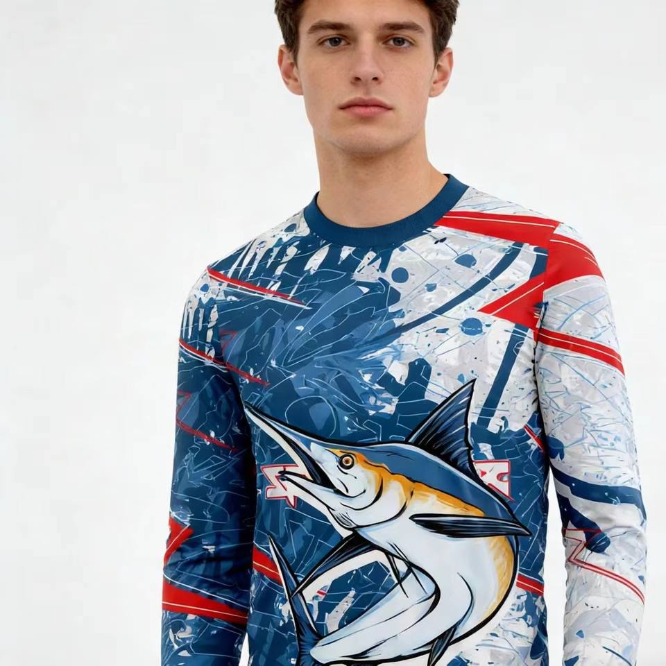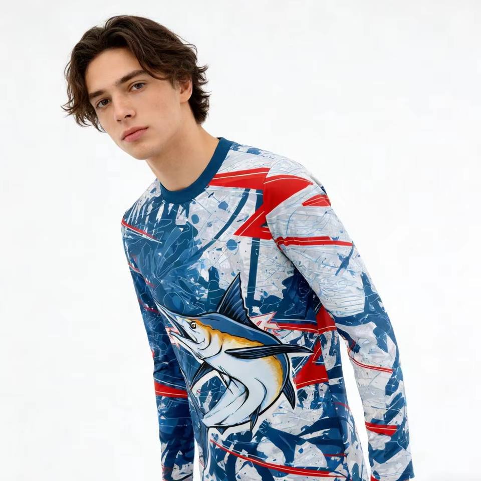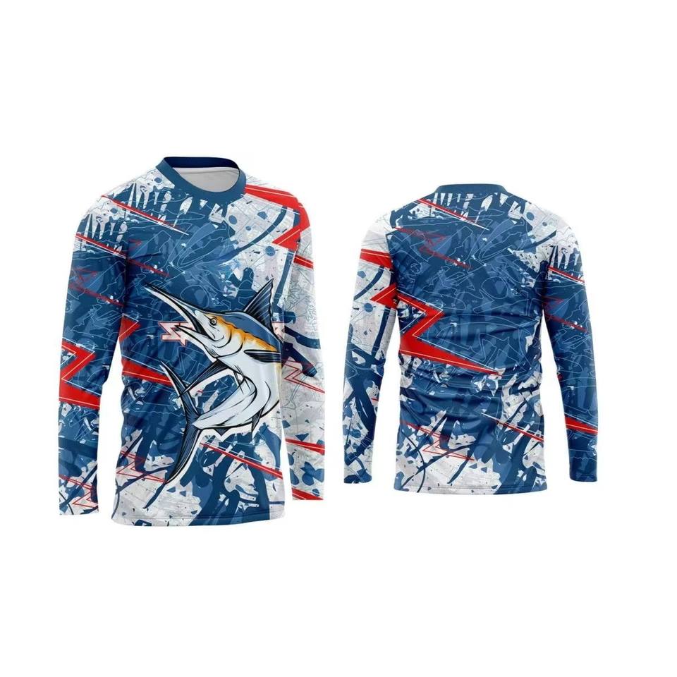 เสื้อตกปลาพิมพ์ลายมาร์ลิน แขนยาว ผ้าโพลีเอสเตอร์ ระบายอากาศ แห้งเร็ว ป้องกันรังสียูวี สำหรับกิจกรรมกลางแจ้ง ตกปลา เดินป่า และกีฬาต่างๆ