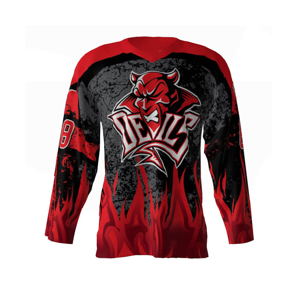 เสื้อฮอกกี้น้ำแข็งแบบซับลิเมชั่นสั่งทำพิเศษ พร้อมโลโก้ทีมแบบซับลิเมชั่นและแบบทวิลล์ ผู้ผลิตชุดทีมฮอกกี้น้ำแข็งแบบ OEM