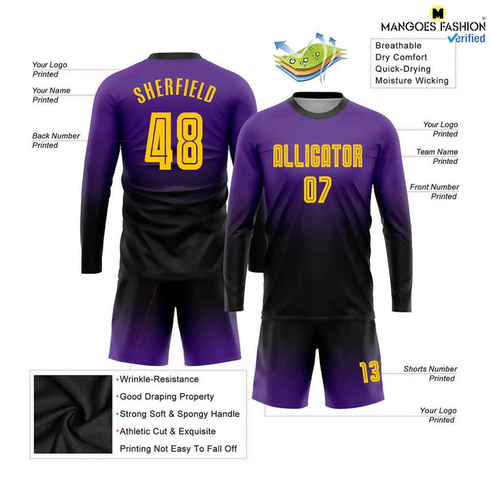 ชุดเสื้อฟุตบอลแขนยาวพิมพ์ลายออกแบบได้ตามต้องการสีม่วง-สีทอง-ดำจางแฟชั่นเข้าคู่กับกางเกงรัดเอวยางยืด
