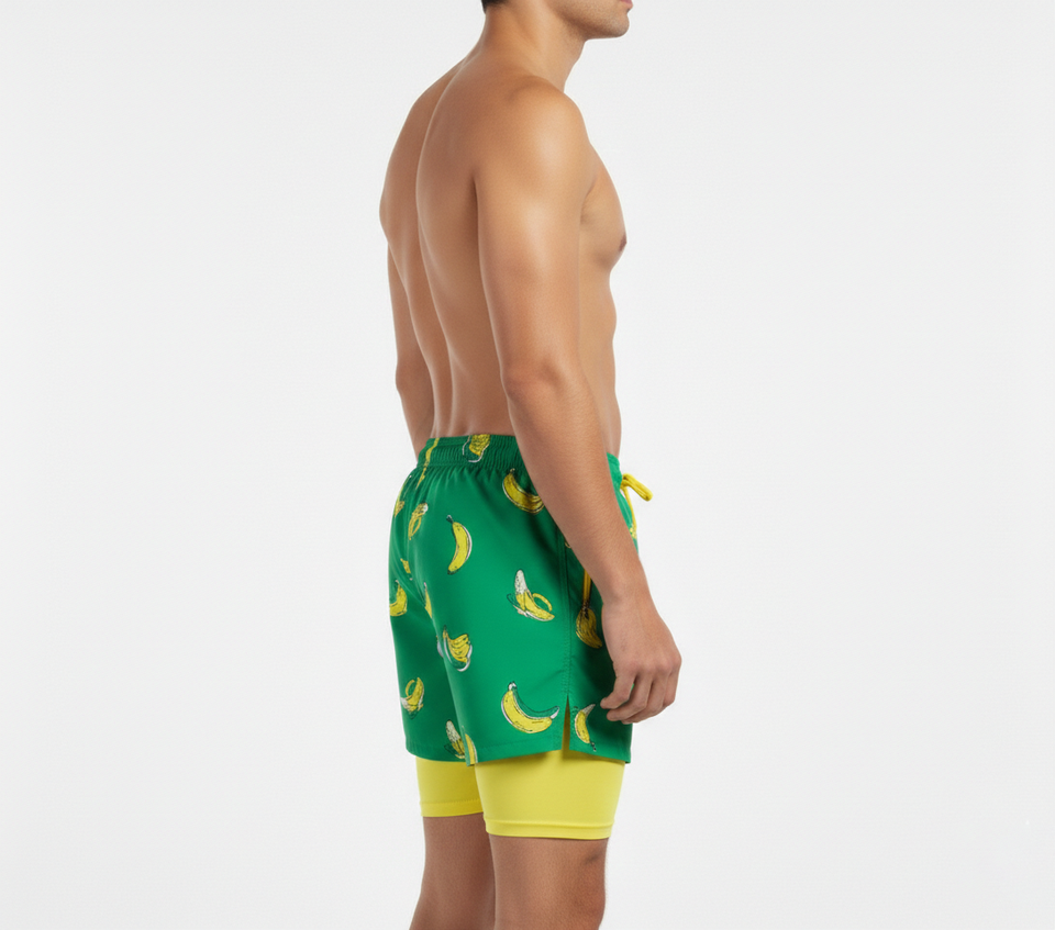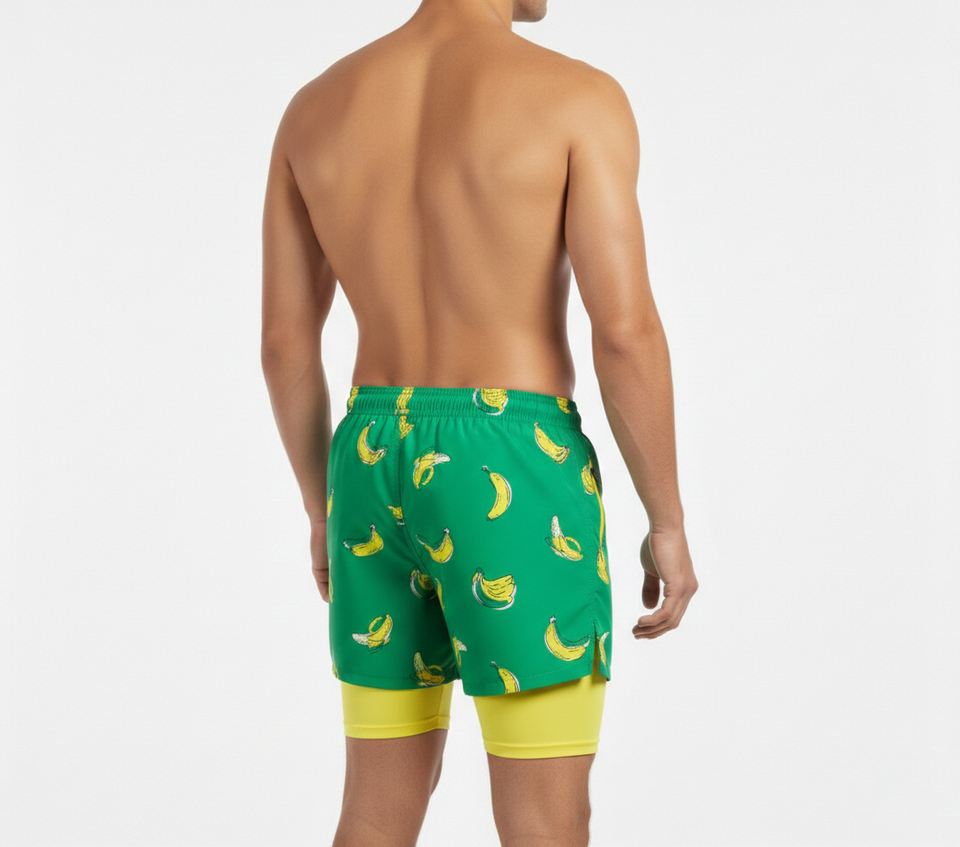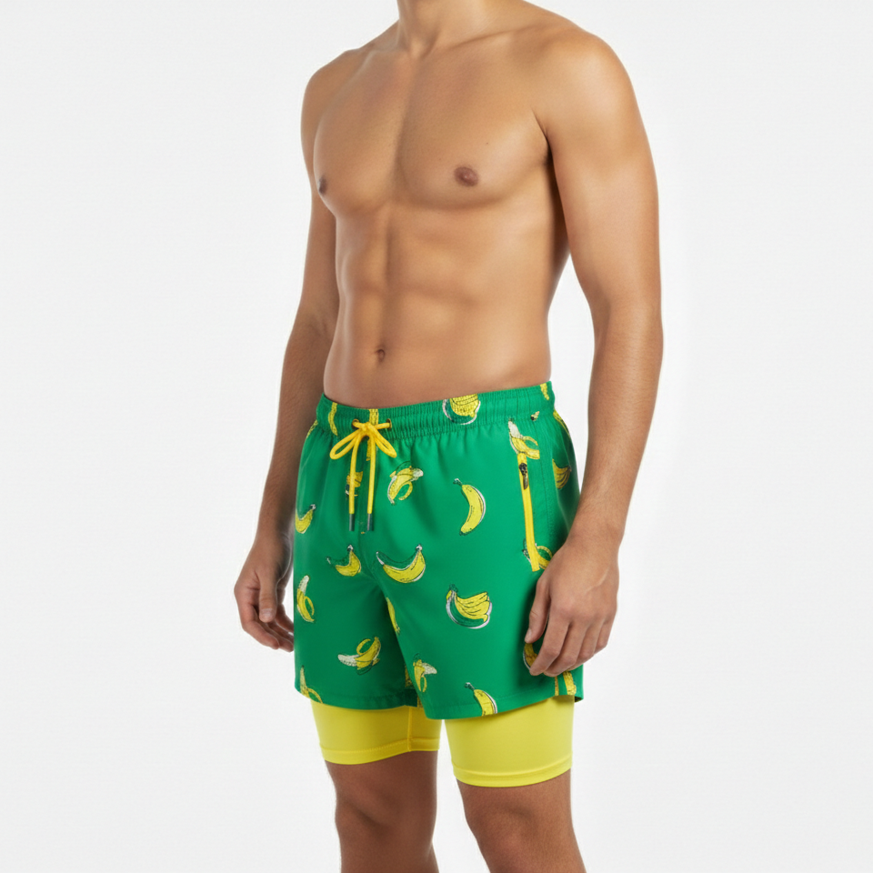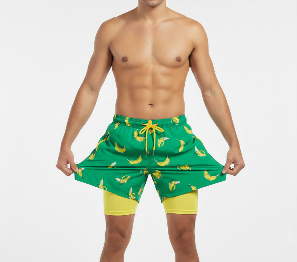 กางเกงชายหาดแบบซับลิเมชั่นสั่งทำพิเศษ 2 in 1 กางเกงว่ายน้ำผู้ชายพร้อมกางเกงเลกกิ้งซับในแบบรัดรูป แฟชั่นทันสมัย แห้งเร็ว