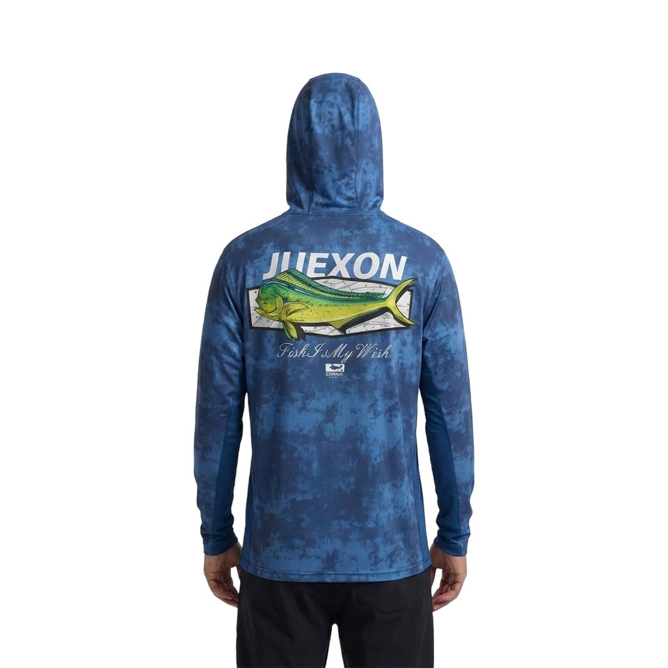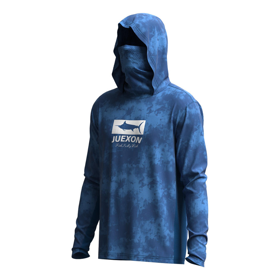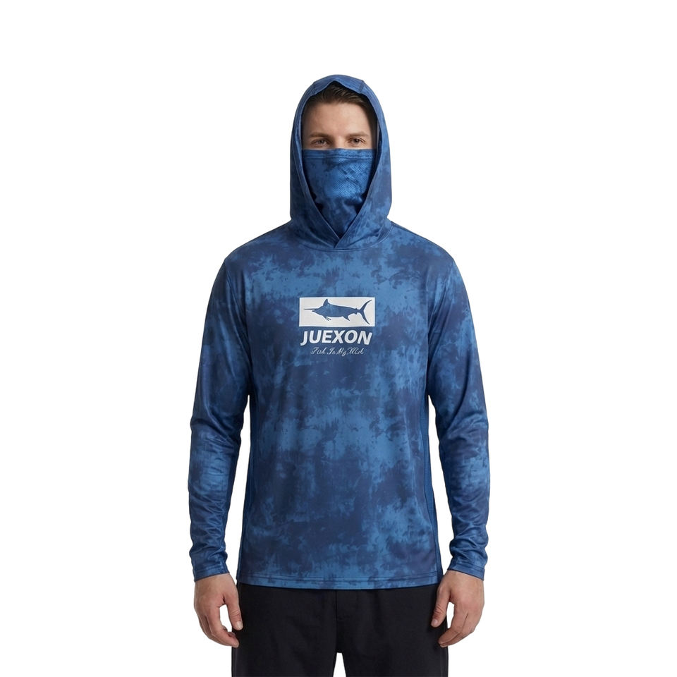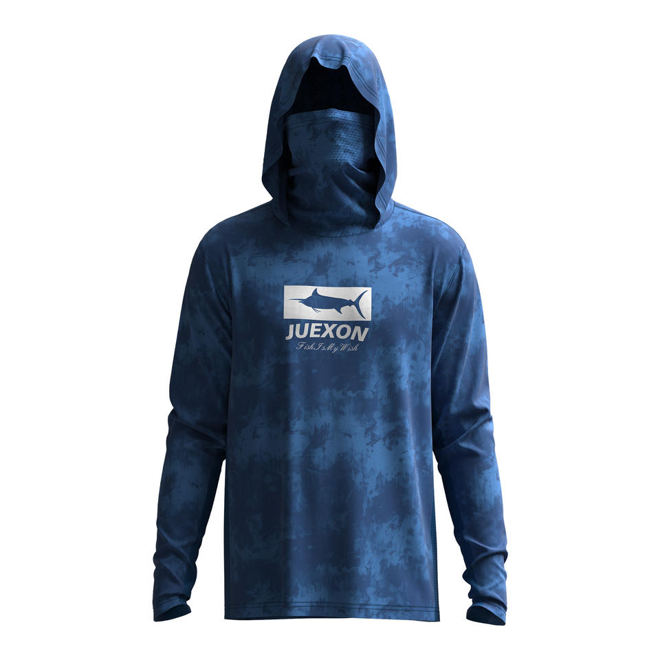 เสื้อยืดแขนยาวมีฮู้ดลายพรางสีน้ำเงินพิมพ์ลายแบบซับลิเมชั่นสำหรับผู้ชาย ผ้าโพลีเอสเตอร์ 100% ระบายอากาศได้ดี กันลม กันน้ำ ป้องกันรังสียูวี