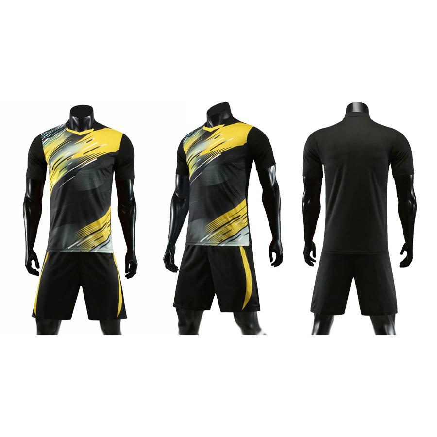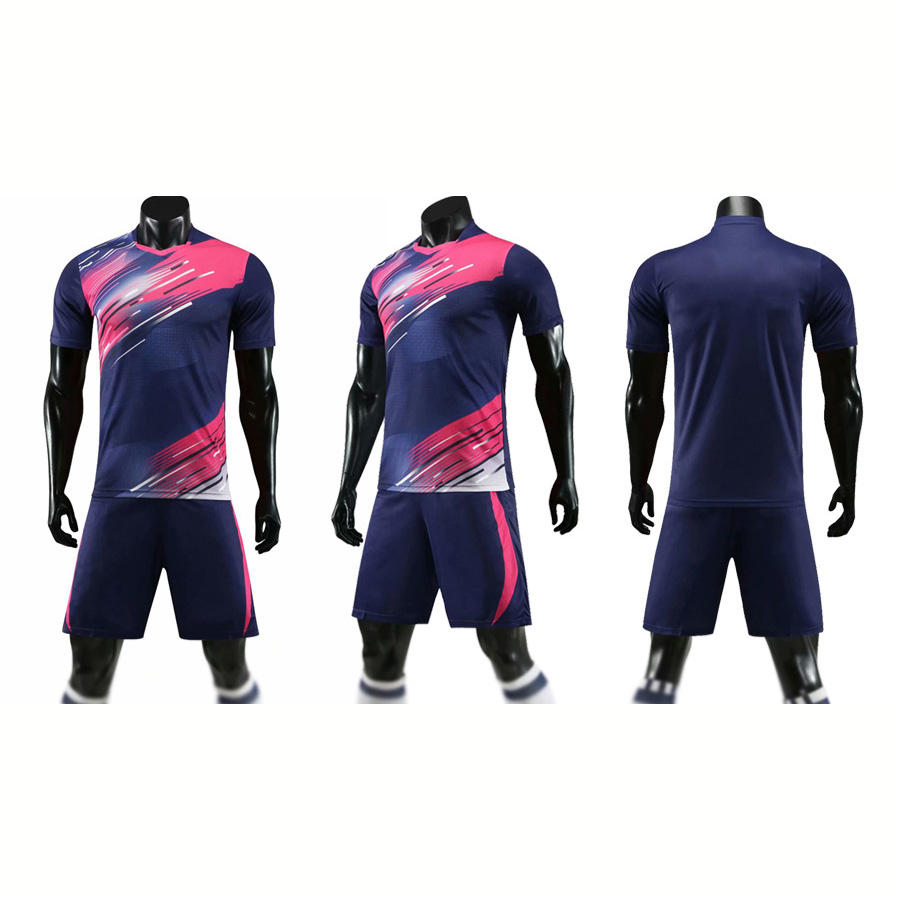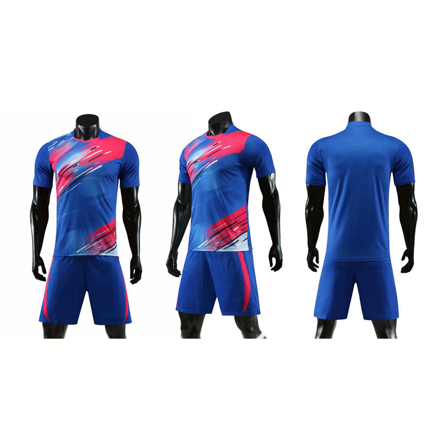 ชุดฟุตบอลแบบซับลิเมชั่นสำเร็จรูปสำหรับผู้ใหญ่และเด็กชาย พร้อมกางเกงขาสั้น ผลิตจากโพลีเอสเตอร์ 100% แห้งเร็ว ชุดยูนิฟอร์มฟุตบอลพร้อมสีที่กำหนดเองได้