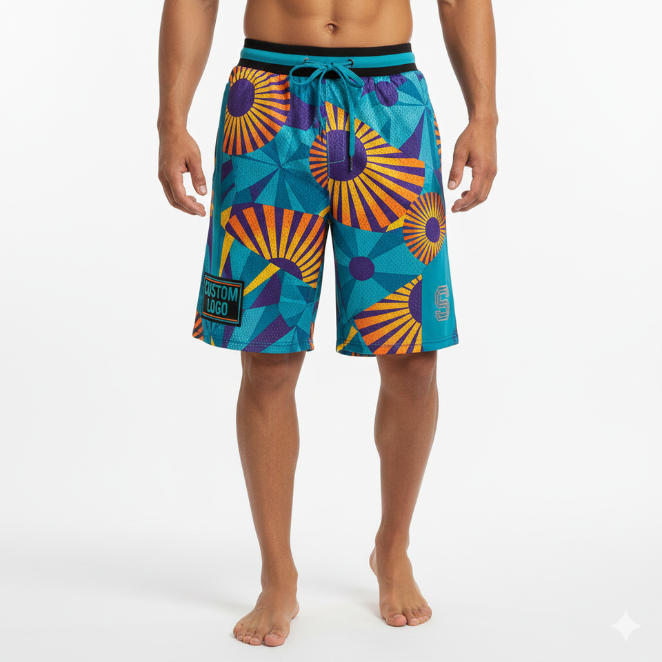 กางเกงบาสเก็ตบอลชายแบบสวมใส่สบายสำหรับเล่นกีฬาชายหาด ผ้าซาตินพิมพ์ลายแบบซับลิเมชั่น โพลีเอสเตอร์ 100% ระบายอากาศได้ดี แห้งเร็ว รุ่น 2026