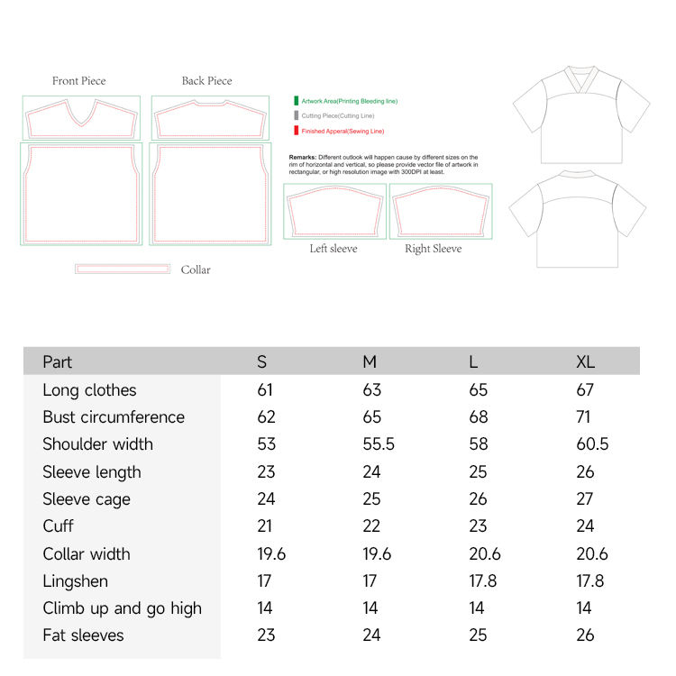 ด้านหน้า, ด้านหลัง, แขนเสื้อด้านซ้าย, แขนเสื้อด้านขวา, ขอบล่าง, หลังคอ