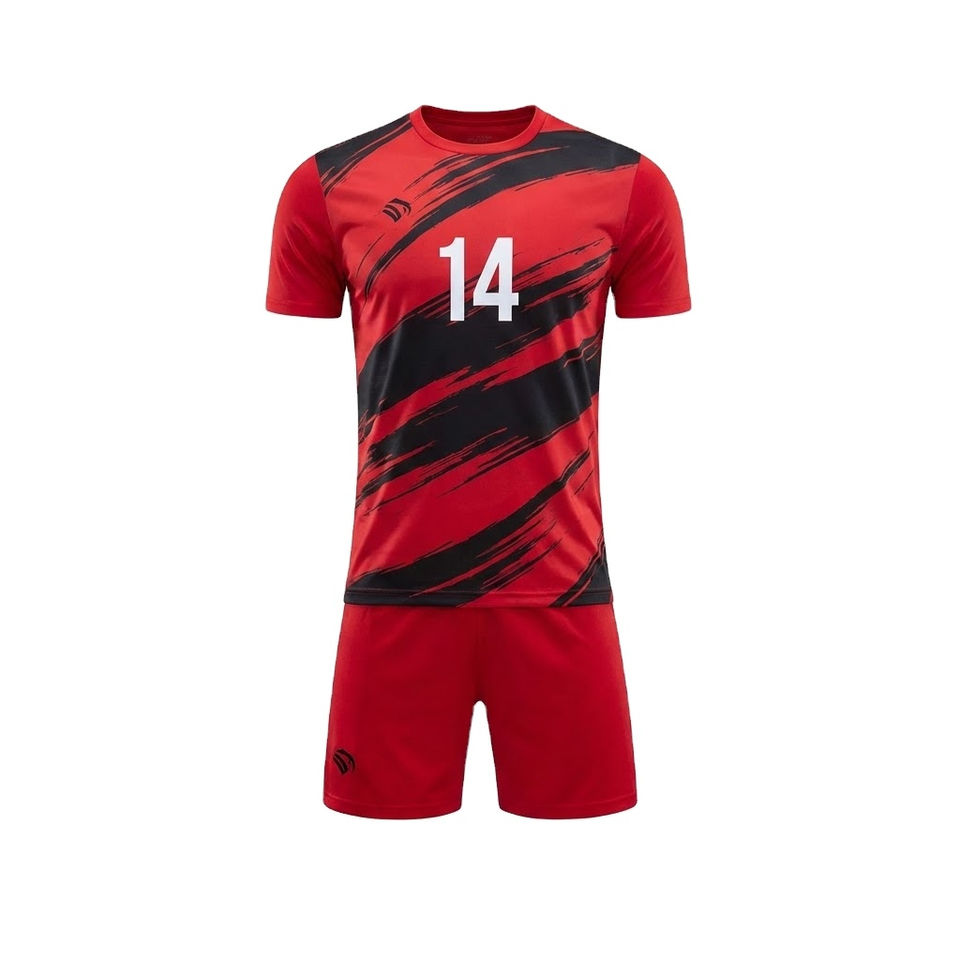 ชุดฟุตบอลแบบซับลิเมชั่นสั่งทำพิเศษสำหรับผู้ชาย สีแดงดำ ชุดฝึกซ้อมทีม พร้อมโลโก้ ชื่อ และหมายเลขสั่งทำได้ ระบายอากาศได้ดี รับผลิตแบบ OEM