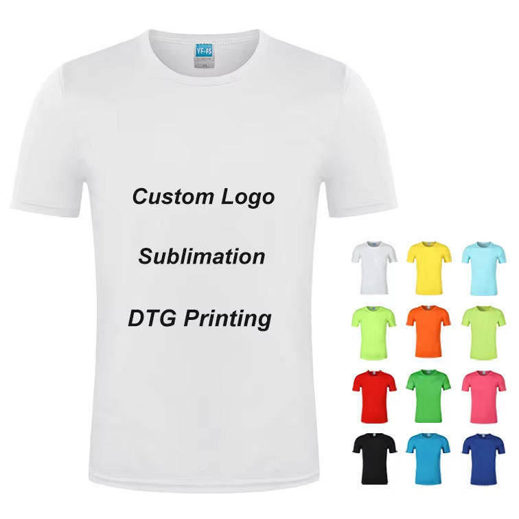 เสื้อยืดซับลิเมชั่นแบบกำหนดเอง 100% โพลีเอสเตอร์ เสื้อยืดเปล่าเรียบสำหรับผู้ชาย พร้อมโลโก้แบบกำหนดเอง พิมพ์ลาย DTG เสื้อยืดกีฬาสำหรับผู้ชาย
