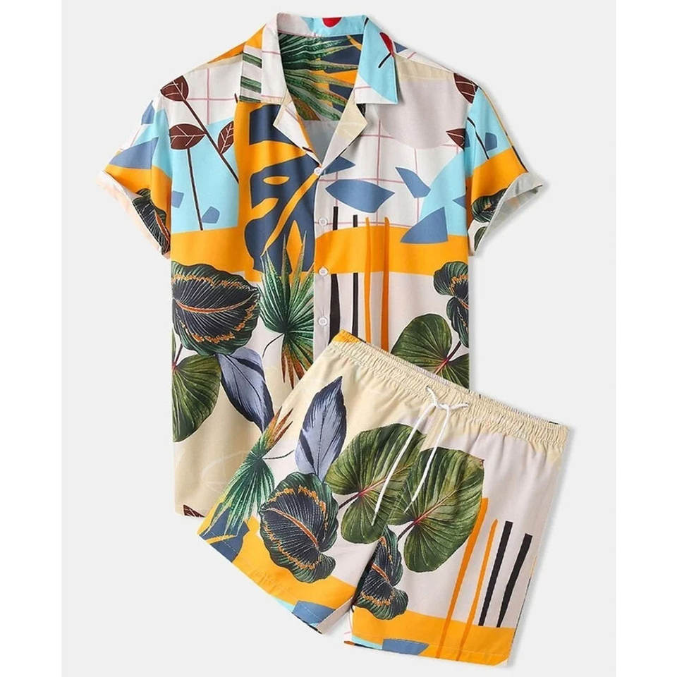 ชุดเสื้อเชิ้ตและกางเกงขาสั้นพิมพ์ลายลําลองฤดูร้อนแบบกําหนดเองชุดเสื้อเชิ้ตชายหาดฤดูร้อนชุดกางเกงหลวม