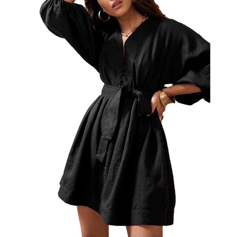 เดรสผ้าลินินคอตตอน 100% สำหรับผู้หญิง สไตล์ลำลองแบบพันรอบตัว สำหรับฤดูร้อน