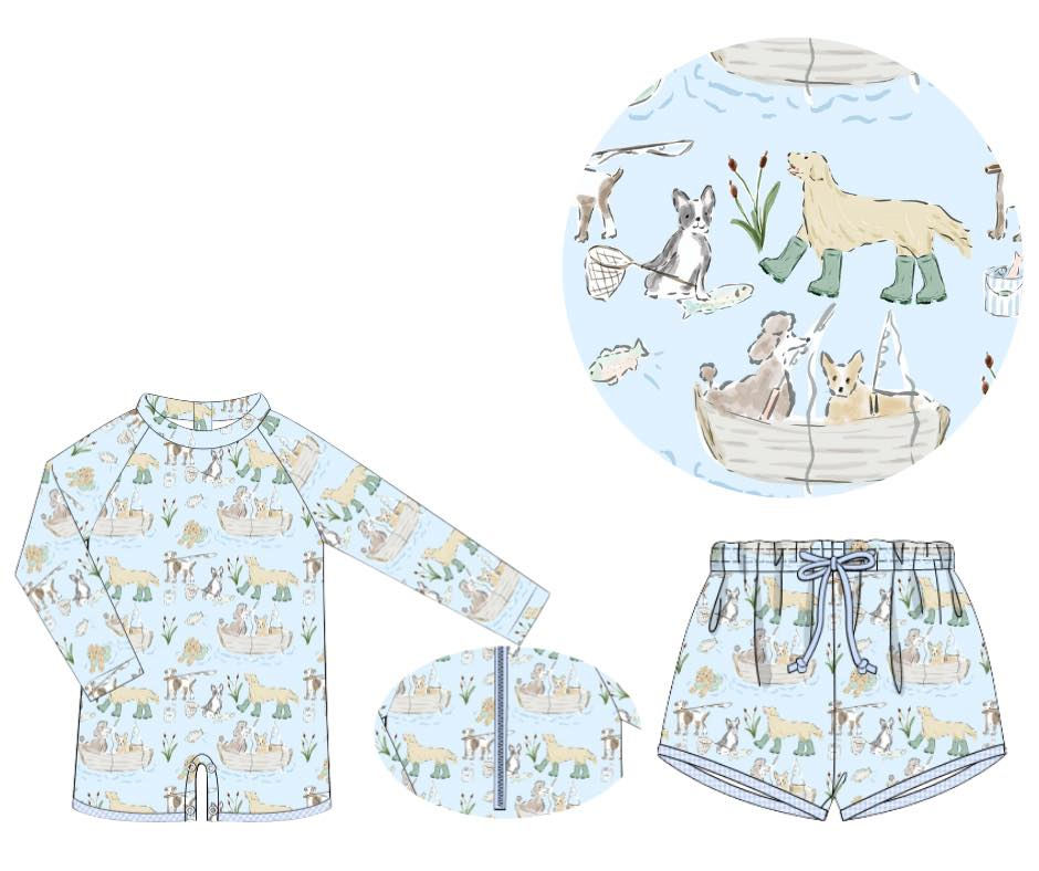 กางเกงว่ายน้ำเด็กผู้ชายลายพิมพ์สุนัขตกปลาฤดูร้อนแบบใหม่ ขายส่ง บูติก ชุดรอมเปอร์เด็กผู้ชาย