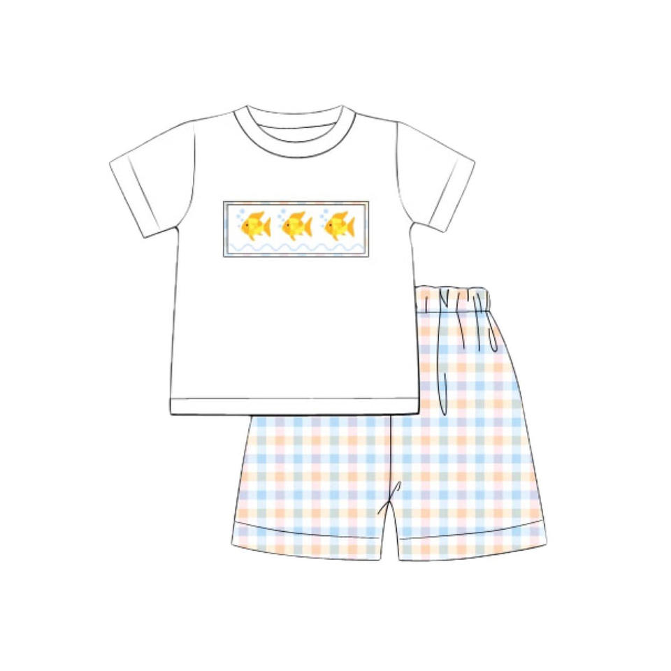 ชุดเซ็ตเสื้อผ้าเด็กผู้ชายลายปลาทองพิมพ์ลายฤดูใบไม้ผลิ/ฤดูใบไม้ร่วง ผ้าคอตตอน 95% ผ้าเนื้อดี กางเกงขาสั้นลำลอง ขายส่ง