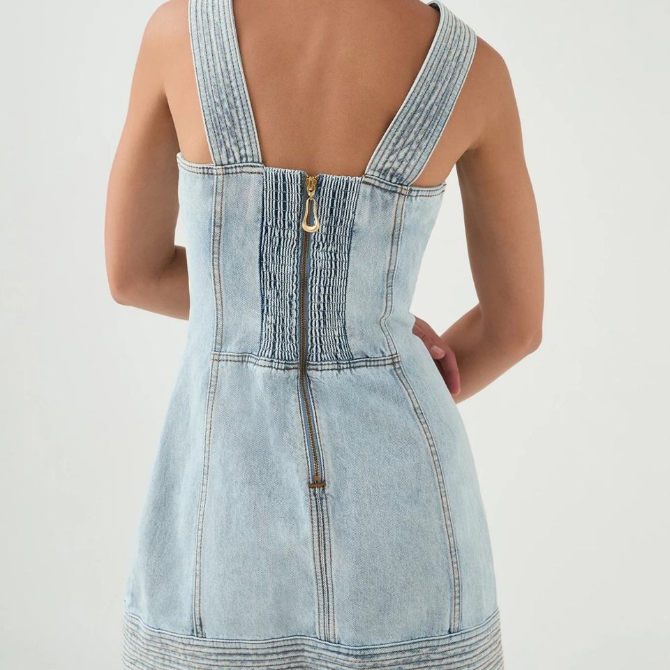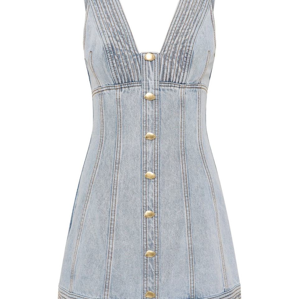 เดรสยีนส์สั้นคอวีแขนกุดสำหรับฤดูร้อน มีกระเป๋า ติดกระดุมด้านหน้าสำหรับผู้หญิง