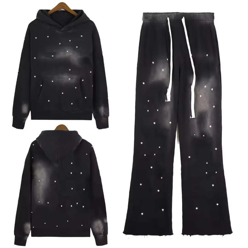 ชุดวอร์มแทรคสูทแบบสเวตแพนท์สั่งทำพิเศษ ลวดลายย้อมสีแบบแอซิดวอช พร้อมเสื้อฮู้ดซิปประดับคริสตัล และกางเกงวอร์มขาบาน ชุดเซ็ตคุณภาพสูง