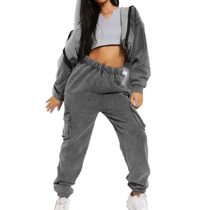 ชุดวอร์มแบบกำหนดเองพร้อมกางเกงปักลายแบบทำสีซีดและเสื้อฮู้ดดี้ ชุดแทรคสูทสำหรับผู้หญิง ขายดีที่สุด รับผลิตแบบ OEM