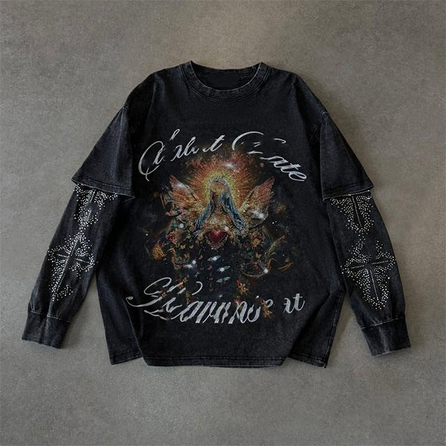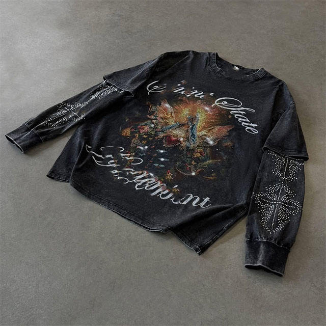 เสื้อสเวตเชิ้ตผู้ชายสกรีนลาย แขนถอดได้ ทรงบ็อกซี่ เสื้อยืดแขนยาวสองชั้นสำหรับผู้ชาย