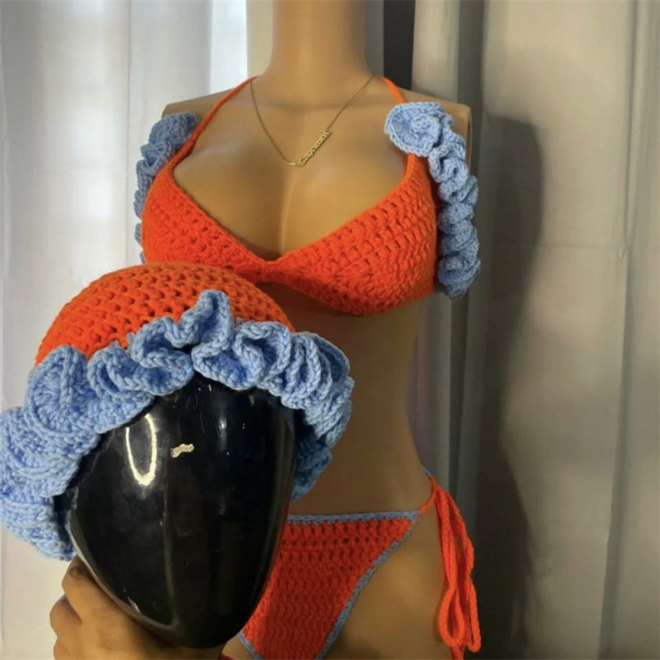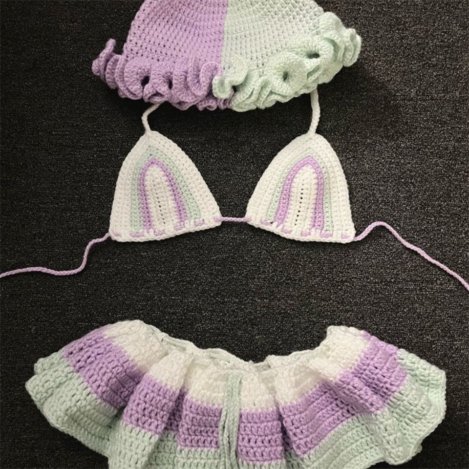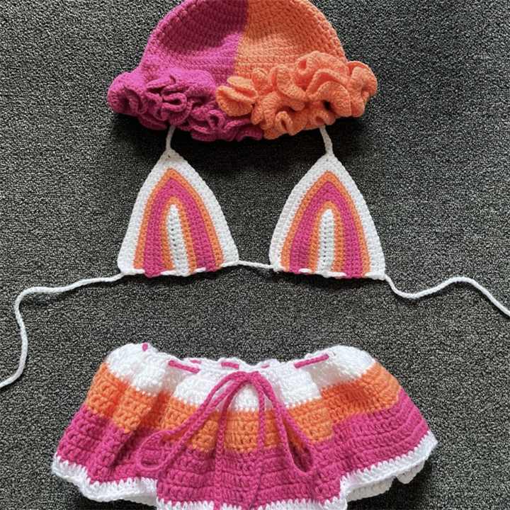 ชุดว่ายน้ำโครเชต์แบบกำหนดเอง ชุดบิกินี่หลากสี ลายรุ้ง เสื้อเปิดไหล่ 2 ชิ้น ชุดว่ายน้ำฟิตเนสไซส์ใหญ่สำหรับผู้หญิง