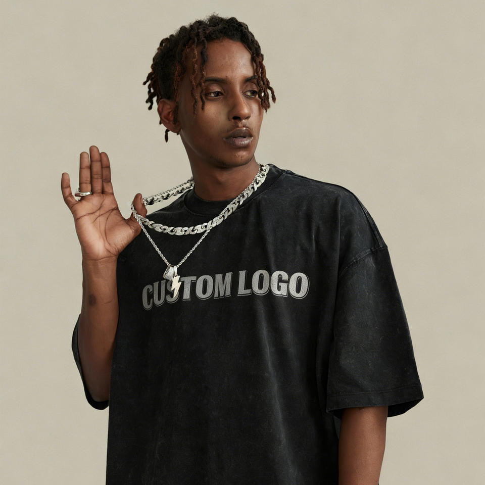 เสื้อยืดคอกลมแขนสั้นทรงหลวมพิมพ์ลายตามสั่ง ผ้าฝ้าย 100% สำหรับผู้ชาย พร้อมโลโก้และป้าย-ดีไซน์ลำลองทันสมัย