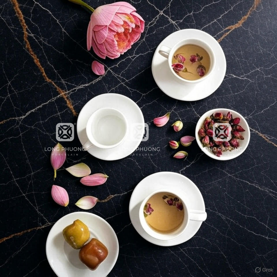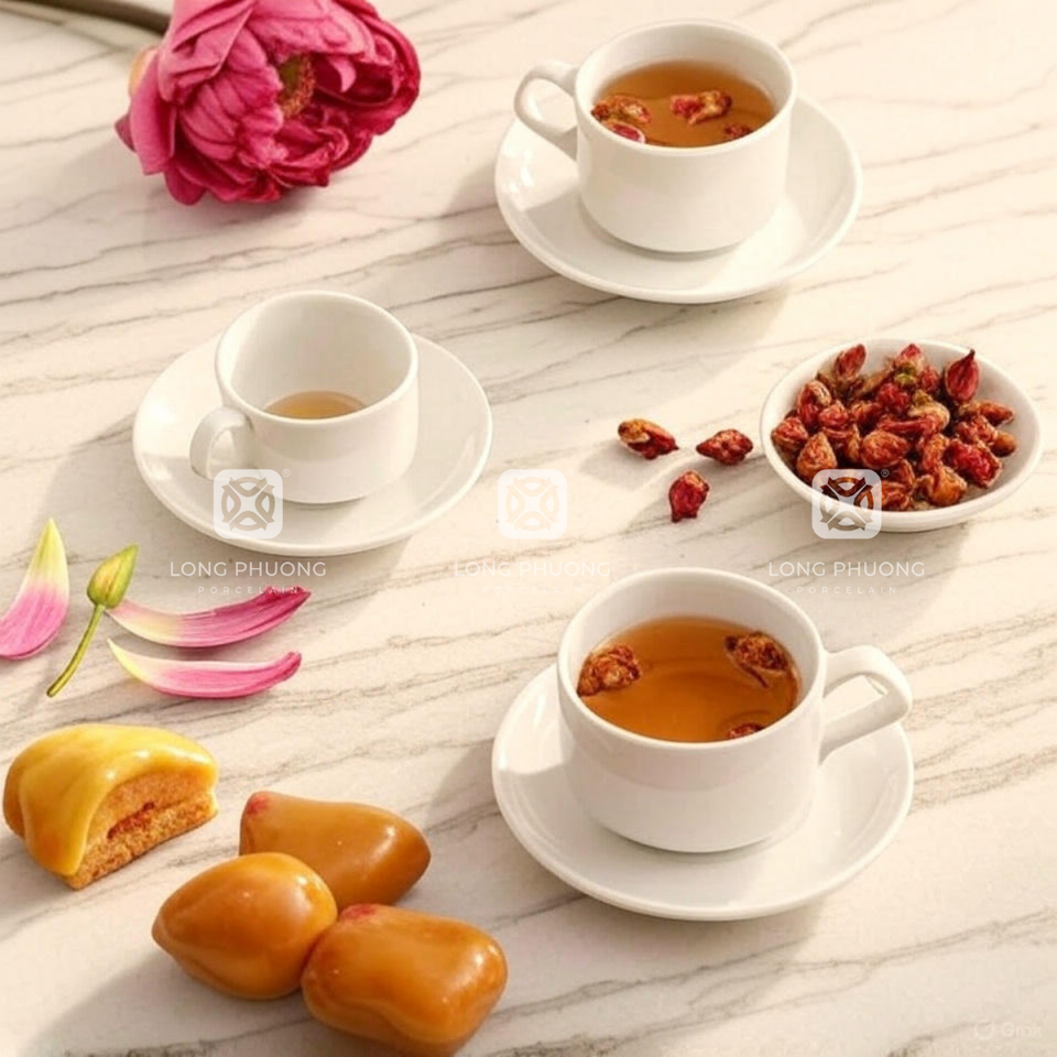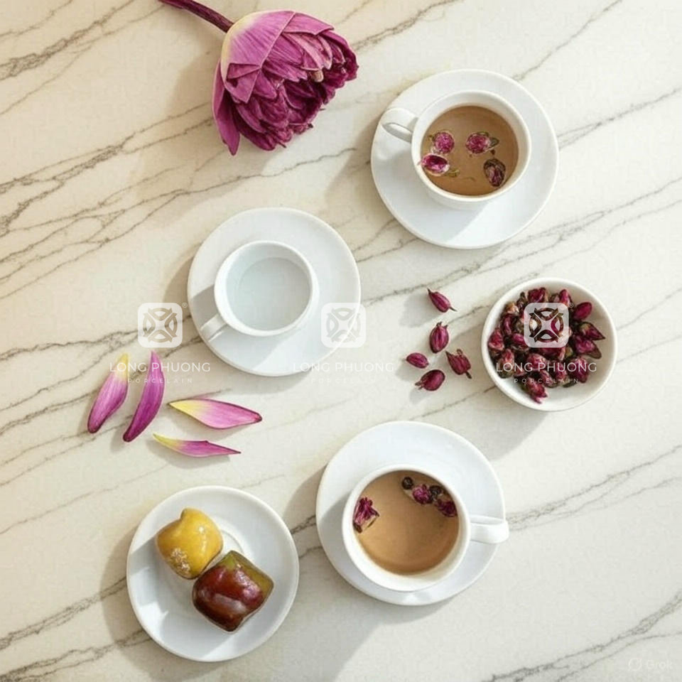 ชุดแก้วพอร์ซเลนสีขาวทรงสูงแบบกำหนดเองสำหรับร้านอาหารทันสมัยแก้วชากาแฟเซรามิกเวียดนามขายส่งรูปแบบที่กำหนดเอง