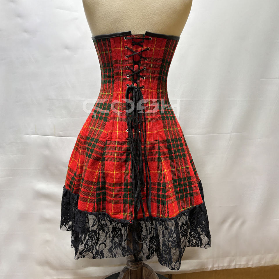 ชุดเดรสคอร์เซ็ททรงโอเวอร์บัสต์ลายสก็อตแบบกำหนดเอง พร้อมขอบลูกไม้ ขายส่งชุดเดรสคอร์เซ็ทแฟชั่นจากผู้ผลิต