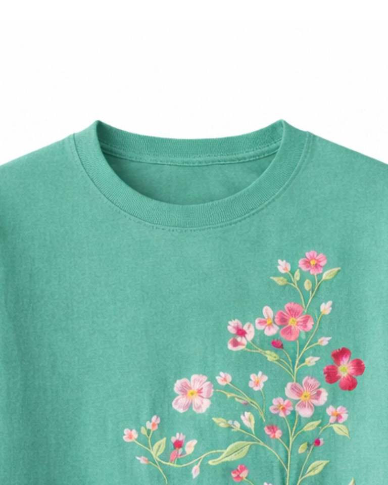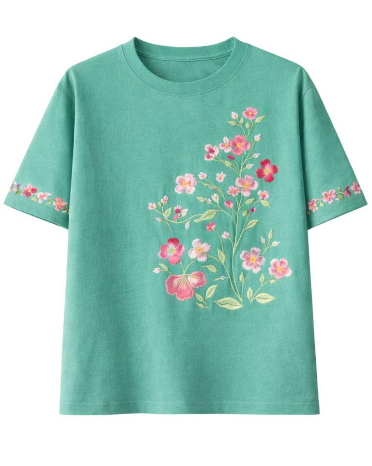 เสื้อยืดพิมพ์ลายดอกไม้สีเขียวอมฟ้าสำหรับผู้หญิง ผ้าฝ้ายนุ่ม คอกลม แขนสั้น สวมใส่สบาย เหมาะสำหรับฤดูร้อน น้ำหนักเบา