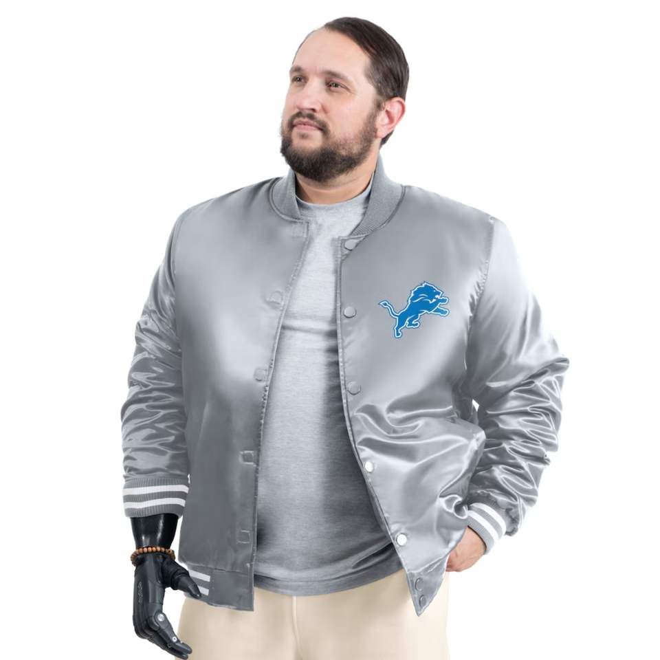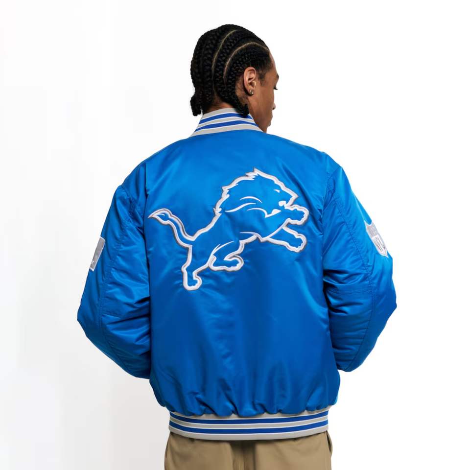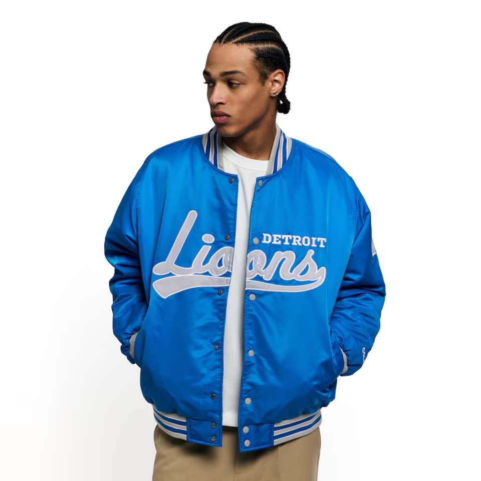 เสื้อแจ็กเก็ตบอมเบอร์ทีมกอล์ฟสำหรับทั้งชายและหญิงแจ็คเก็ตเบสบอลสีน้ำเงินลายสิงโตดีทรอยต์
