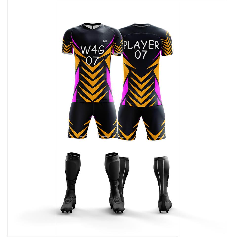 ชุดเสื้อฟุตบอลชายพร้อมกางเกงขาสั้น พิมพ์ลายแบบซับลิเมชั่น ระบายอากาศ แห้งเร็ว เป็นมิตรกับสิ่งแวดล้อม 100% ออกแบบโลโก้ทีมตามสั่งได้