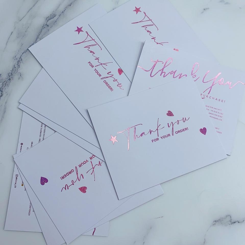 การ์ดขอบคุณแบบกำหนดเองพร้อมการพิมพ์ฟอยล์สีชมพูโรสโกลด์ - การ์ดอวยพรสองภาษา ภาษาอังกฤษและภาษาสเปน สำหรับอีคอมเมิร์ซ