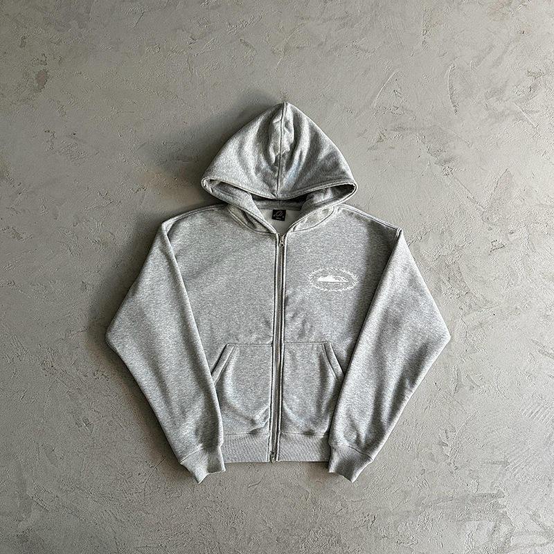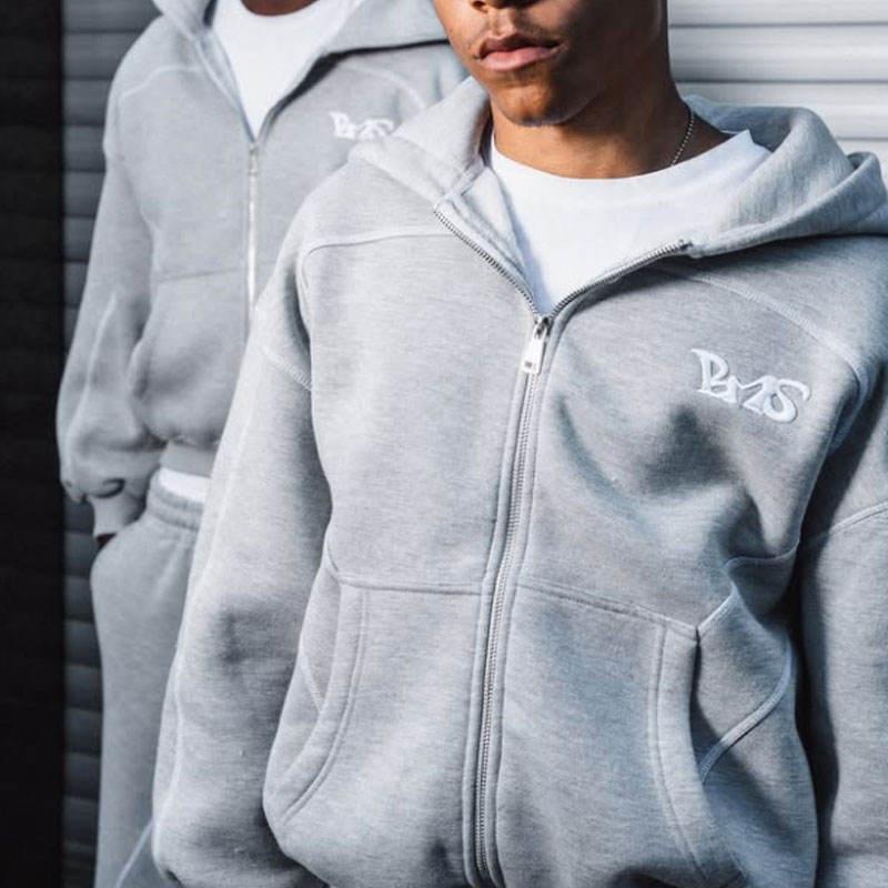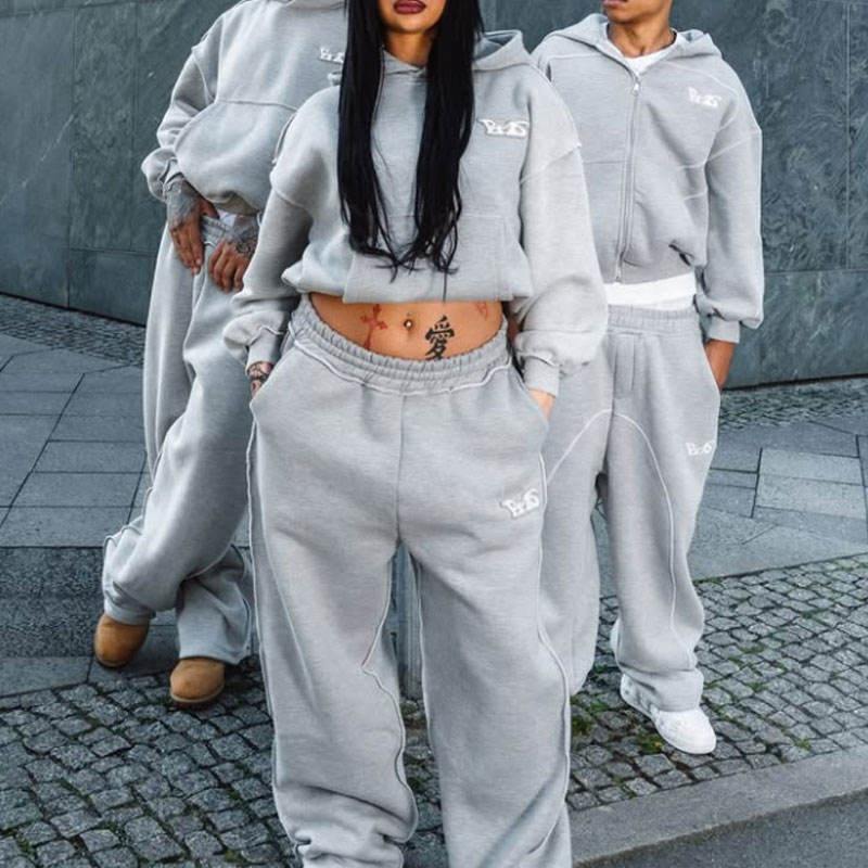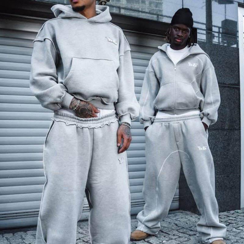 ชุดวอร์มกางเกงและมีฮู้ดสำหรับผู้ชายผ้าคอตตอนเทอร์รี่ผ้าฝ้ายหนาสองชั้นทรงหลวมโอเวอร์ไซส์สีเทาแบบกำหนดเอง
