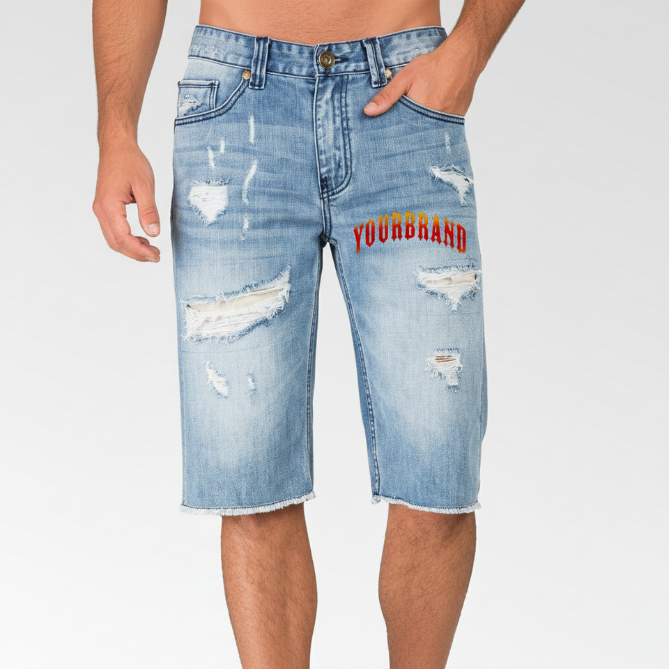 Custom Tipped Mid Waist Solid Acid Washed Denim Men's Custom Embroidery Frayed Hems High Street Style Jean Shorts for Autumn