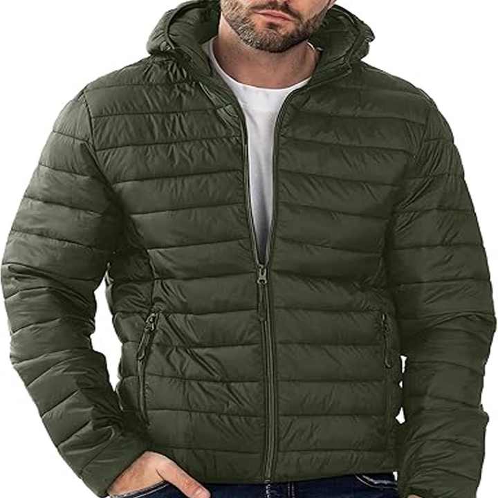 เสื้อแจ็คเก็ตบุขนเป็ดผู้ชายคุณภาพสูงแบบมีฮู้ด น้ำหนักเบา ซิปหน้า สไตล์พัฟเฟอร์