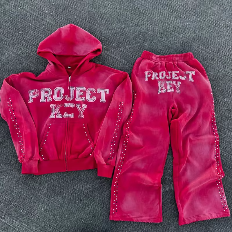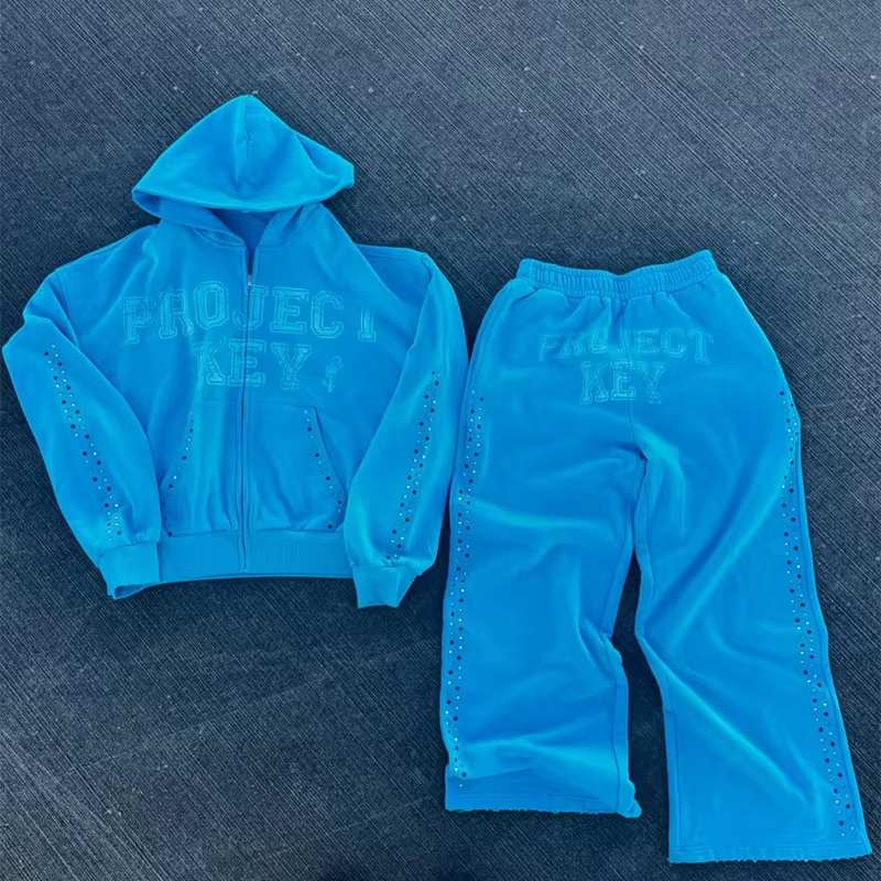 ชุดวอร์มแบบกำหนดเอง ชุดจ็อกเกอร์คุณภาพสูง กางเกงวอร์มขาบานสำหรับผู้ชายและชุดฮู้ดดี้ ชุดวอร์มผ้าฝ้าย ชุดฮู้ดดี้มีซิปประดับเพชร