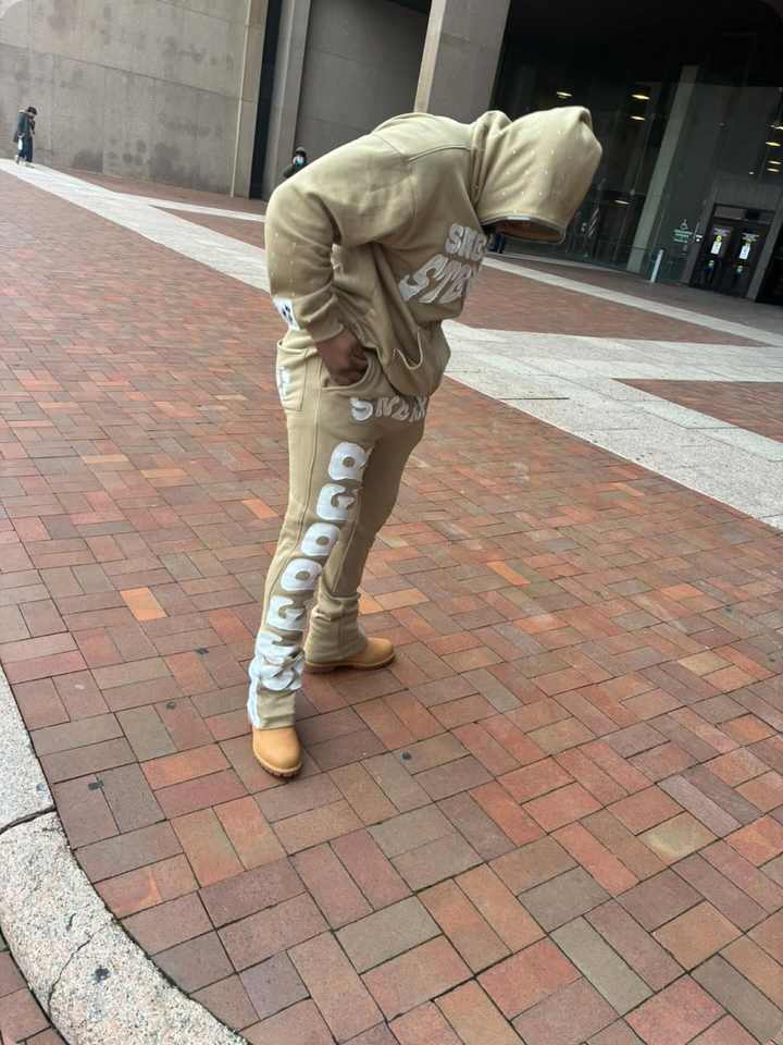 ชุดวอร์มผู้ชายแบบสั่งทำพิเศษ เสื้อฮู้ดดี้และกางเกงขายาวลายฟอกสี พร้อมปักลายปะติดแบบดิสเทรส