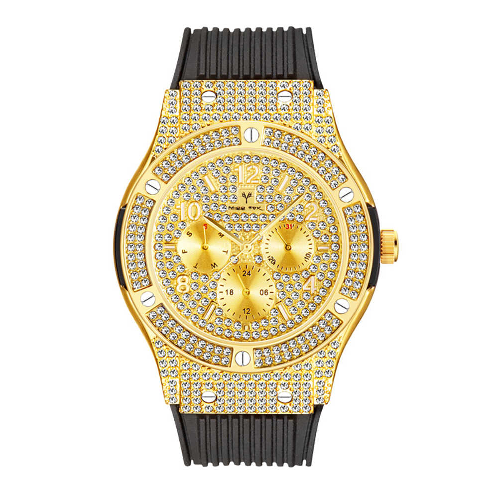 นาฬิกาฮิปฮอปส่องแสงเป็นประกายวิบวับสำหรับผู้ชาย,นาฬิกาแบรนด์ชั้นนำหรูหราไอเย็นใส่แล้วดูเพชรสีทองกันน้ำนาฬิกาควอตซ์สำหรับผู้ชาย