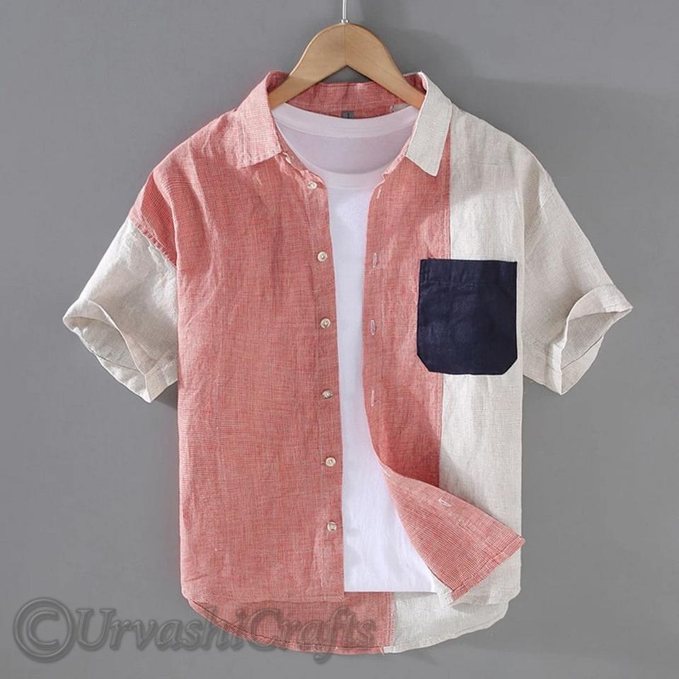 Custom Trendy Patchwork Men's Shirt Turndown Collar Short Sleeve Shirt 100% Cotton Linen Men's Casual Shirts at Wholesale Prices