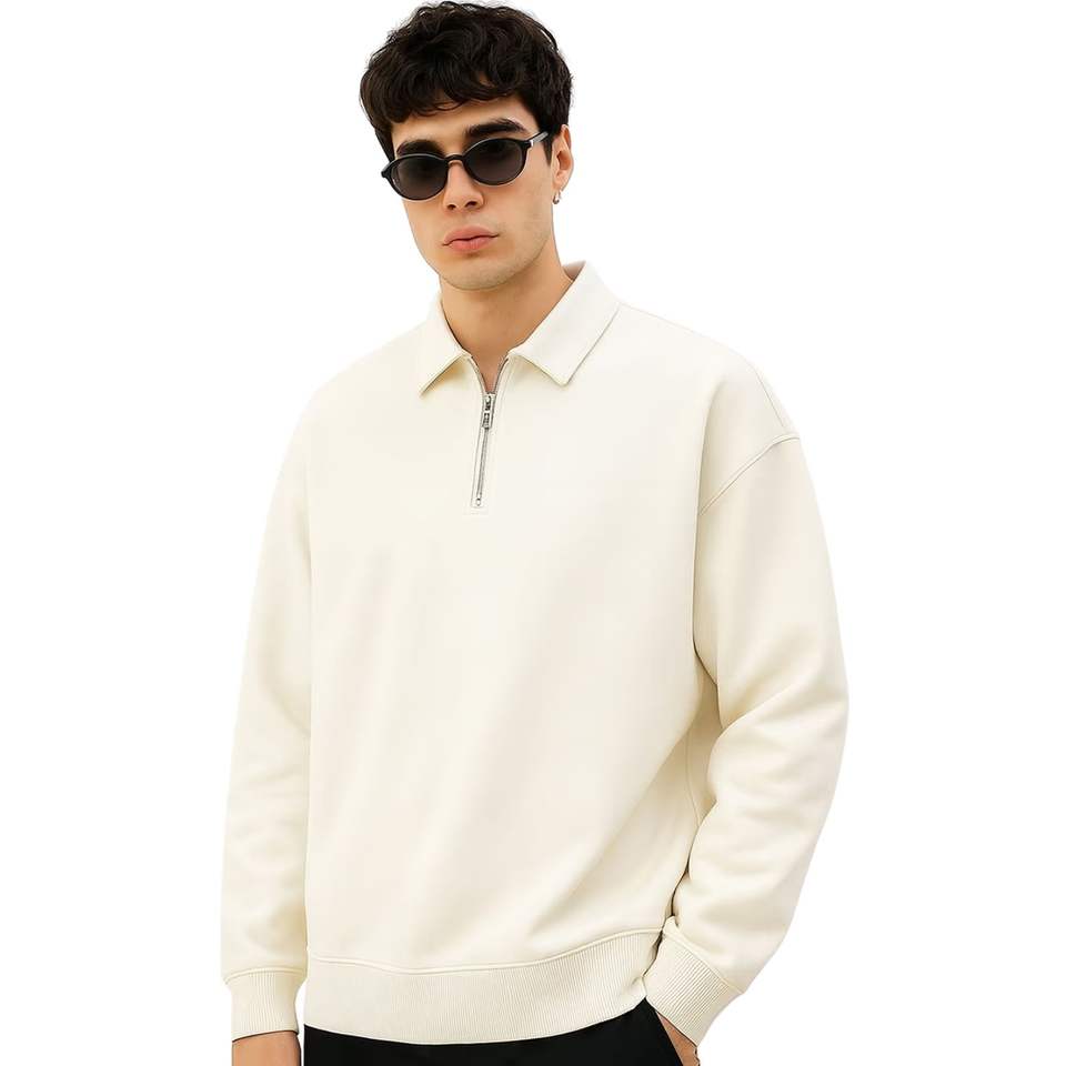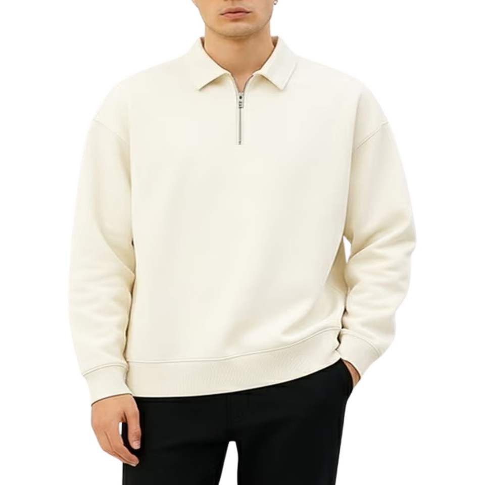 เสื้อสเวตเชิ้ตคอปกแบบพับได้สำหรับผู้ชายและผู้หญิง ผ้าหนา 350gsm ซิป ¼ รับสกรีนโลโก้ ล้างสีแบบสโตนวอช ทรงหลวม