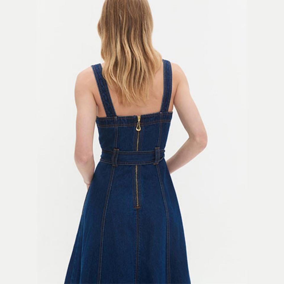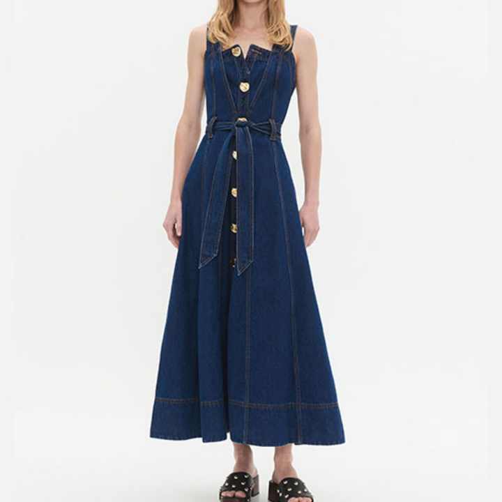 เดรสยีนส์ยาวทรงแม็กซี่สำหรับผู้หญิง สายคาดเอวคู่แบบถอดได้ ซิปหลัง ผ้าฝ้าย แขนกุด