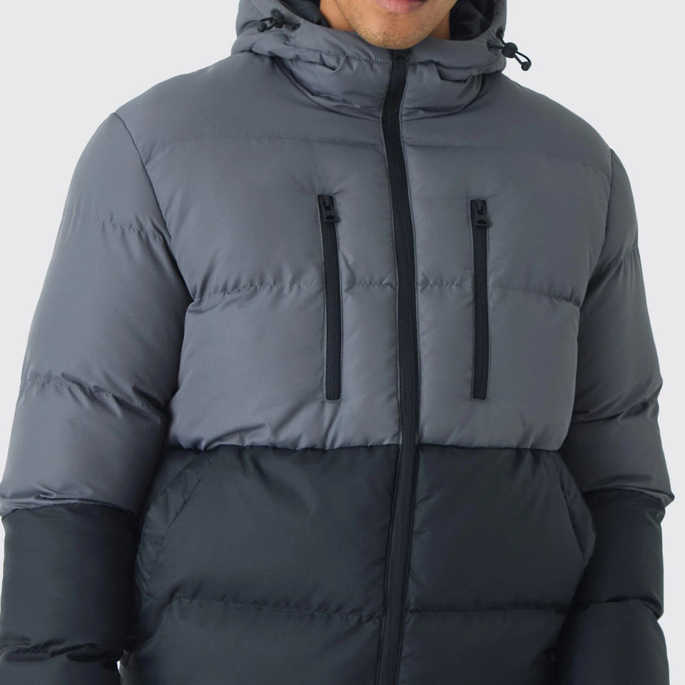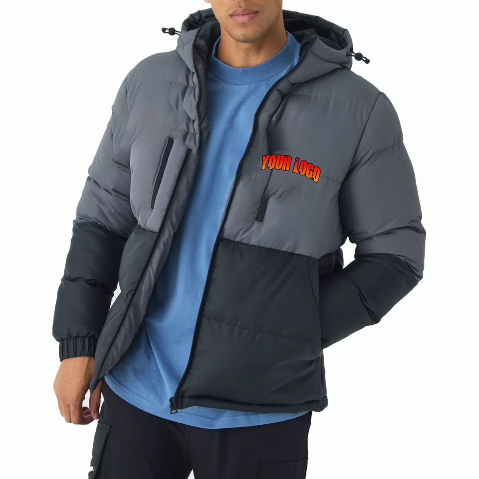 เสื้อแจ็คเก็ตพัฟเฟอร์แบบมีฮู้ดสองสีสำหรับผู้ชาย สีเทาและสีดำ เสื้อโค้ทกันหนาวแบบเย็บติดกัน มีกระเป๋าซิปและโลโก้ เสื้อแจ็คเก็ตฤดูหนาว