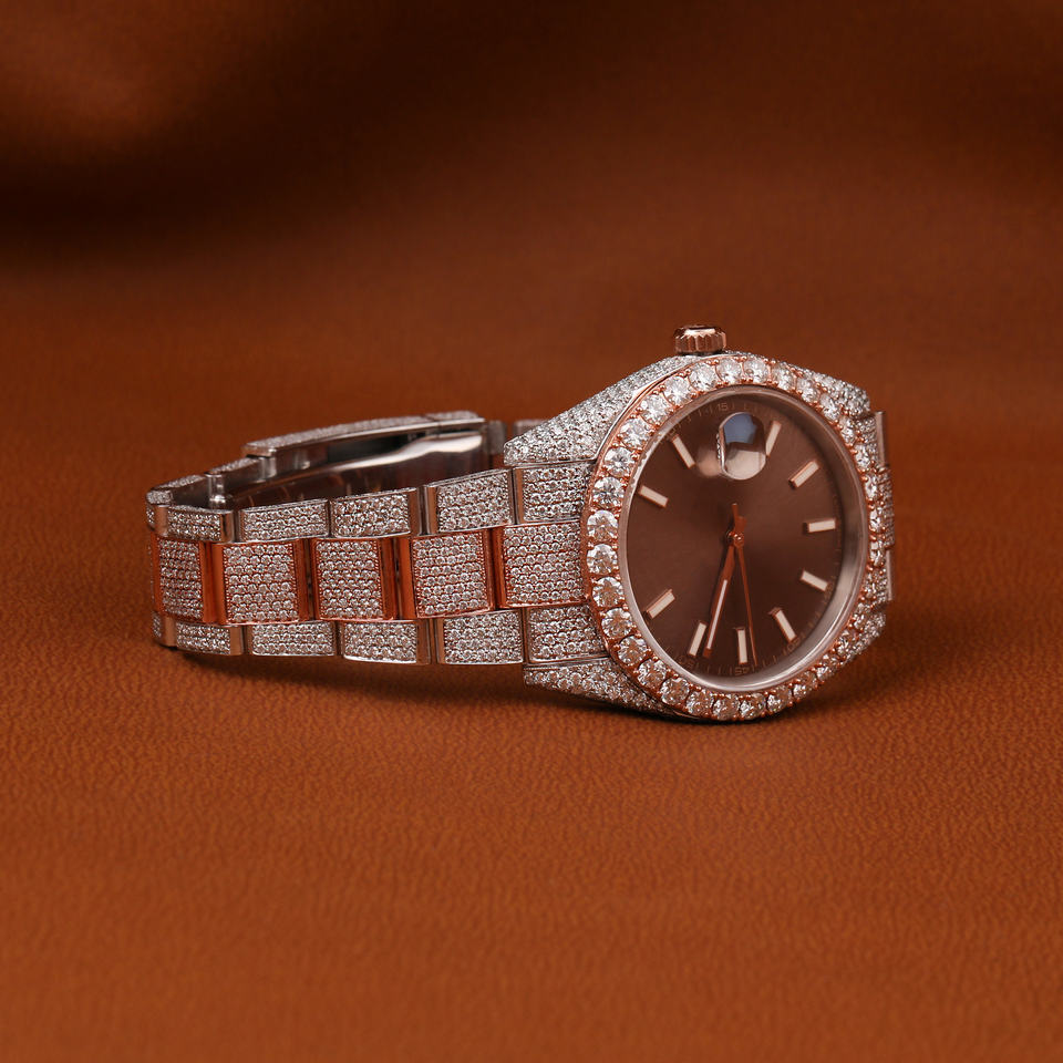 นาฬิกาเพชรโมอิสทรงกลมสีขาวกุหลาบสองสีแบบกำหนดเองได้นาฬิกาช็อคโกแลตมีคุณสมบัติหน้าปัดเพชรสำหรับผู้ชาย