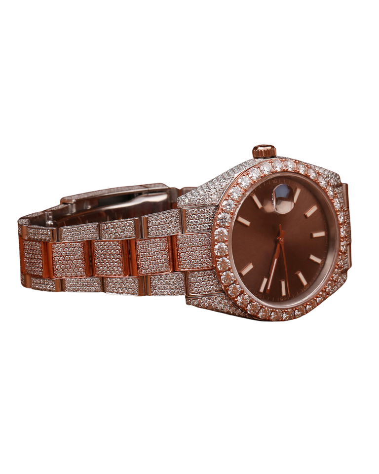 นาฬิกาเพชรโมอิสทรงกลมสีขาวกุหลาบสองสีแบบกำหนดเองได้นาฬิกาช็อคโกแลตมีคุณสมบัติหน้าปัดเพชรสำหรับผู้ชาย